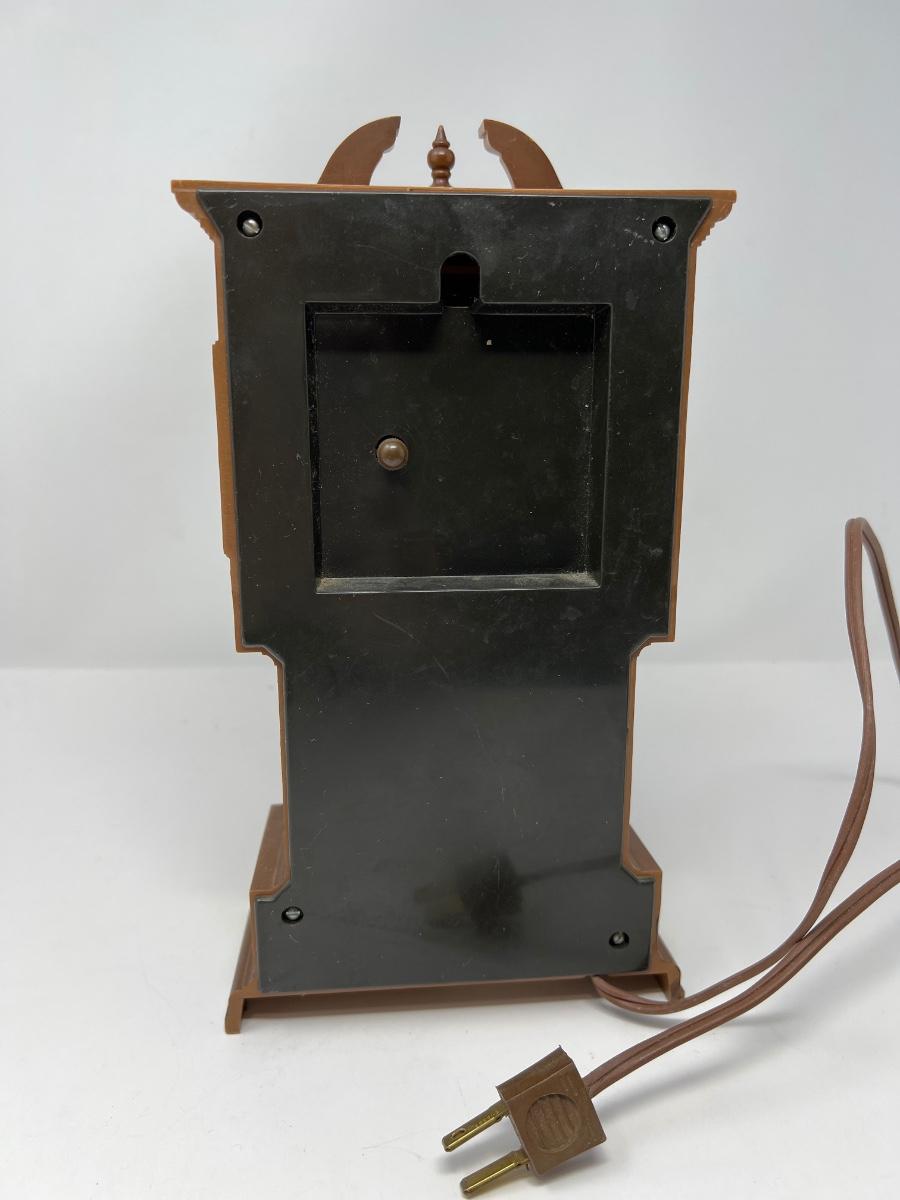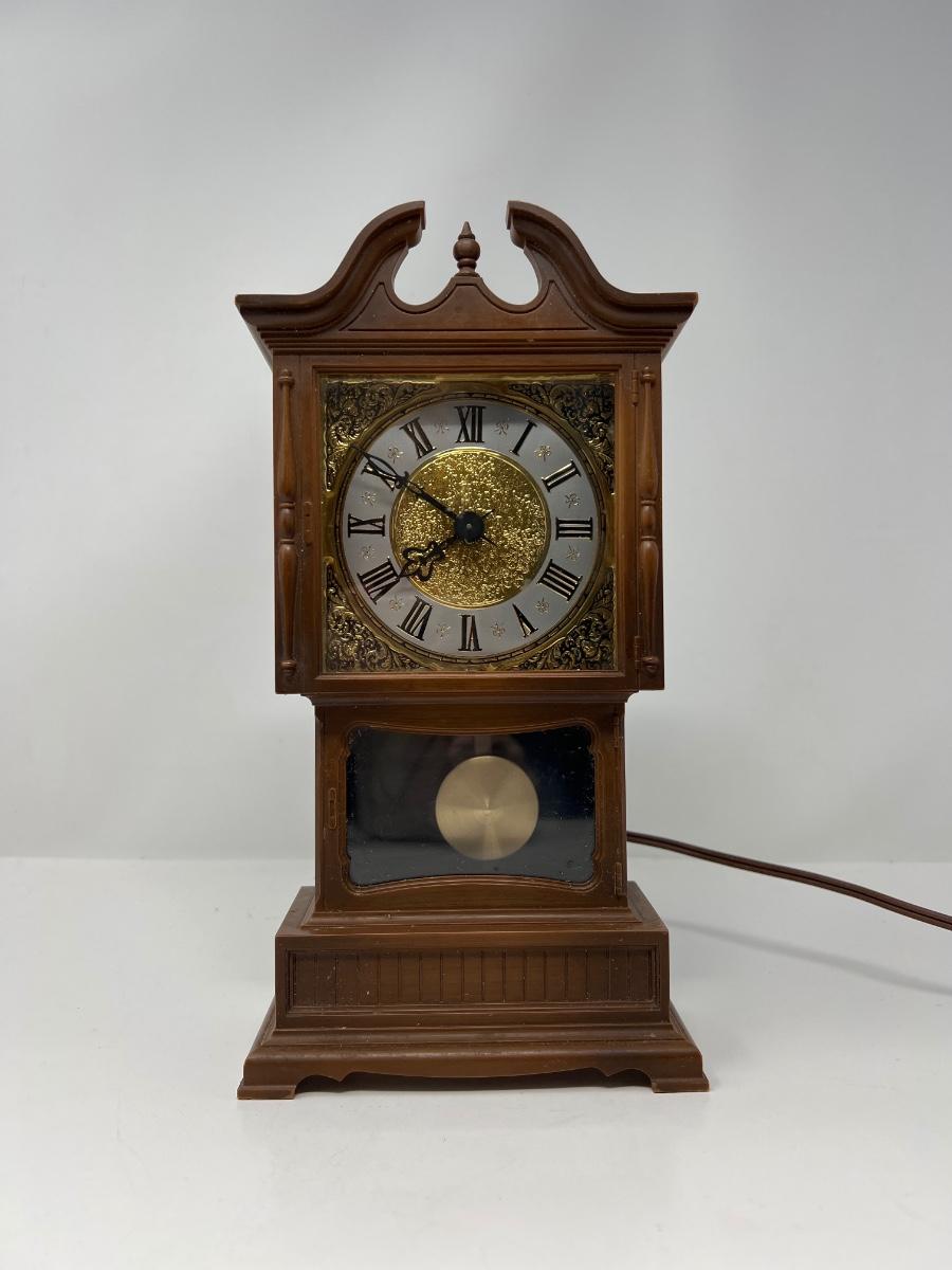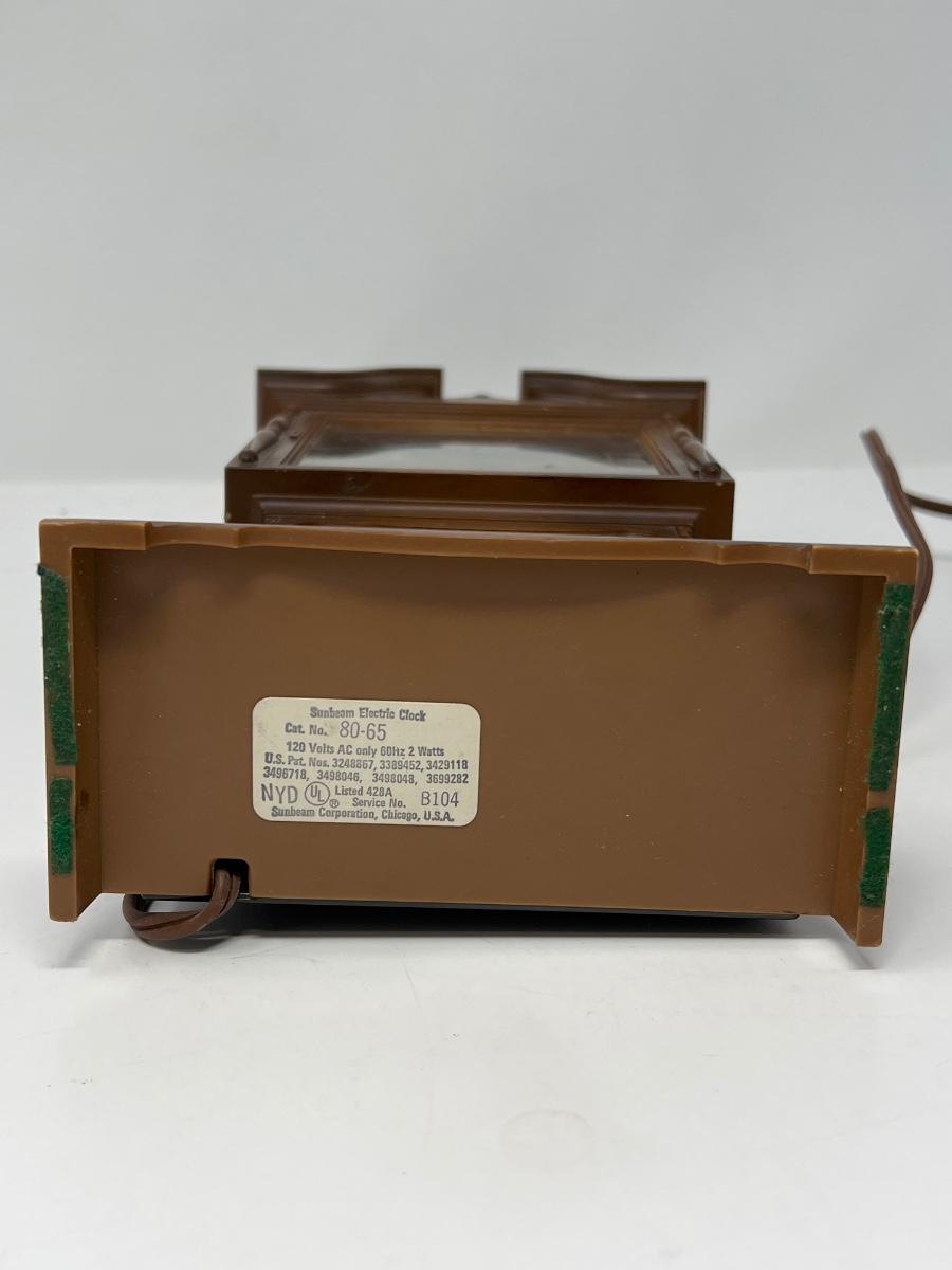 Clock stands 10” tall x 5” wide x 2.5” deep; it is made in Chicago by Sunbeam Electric Company. Uses electricity to run. Powers on. Hands can be moved to change time by using knob in back. Pendulum swings when operating.