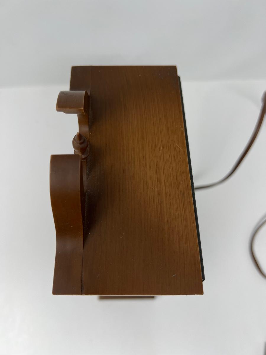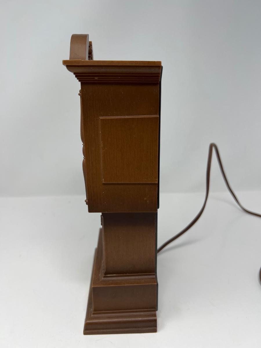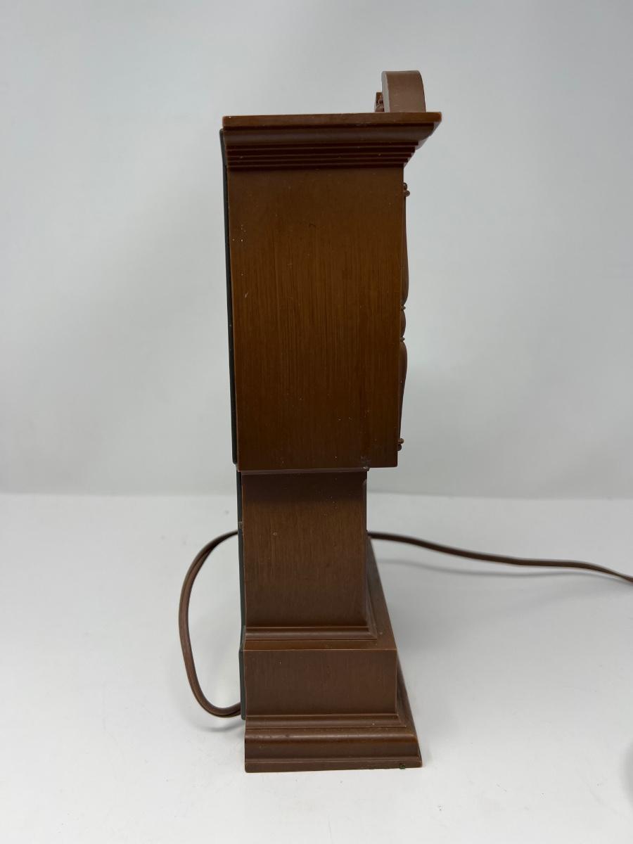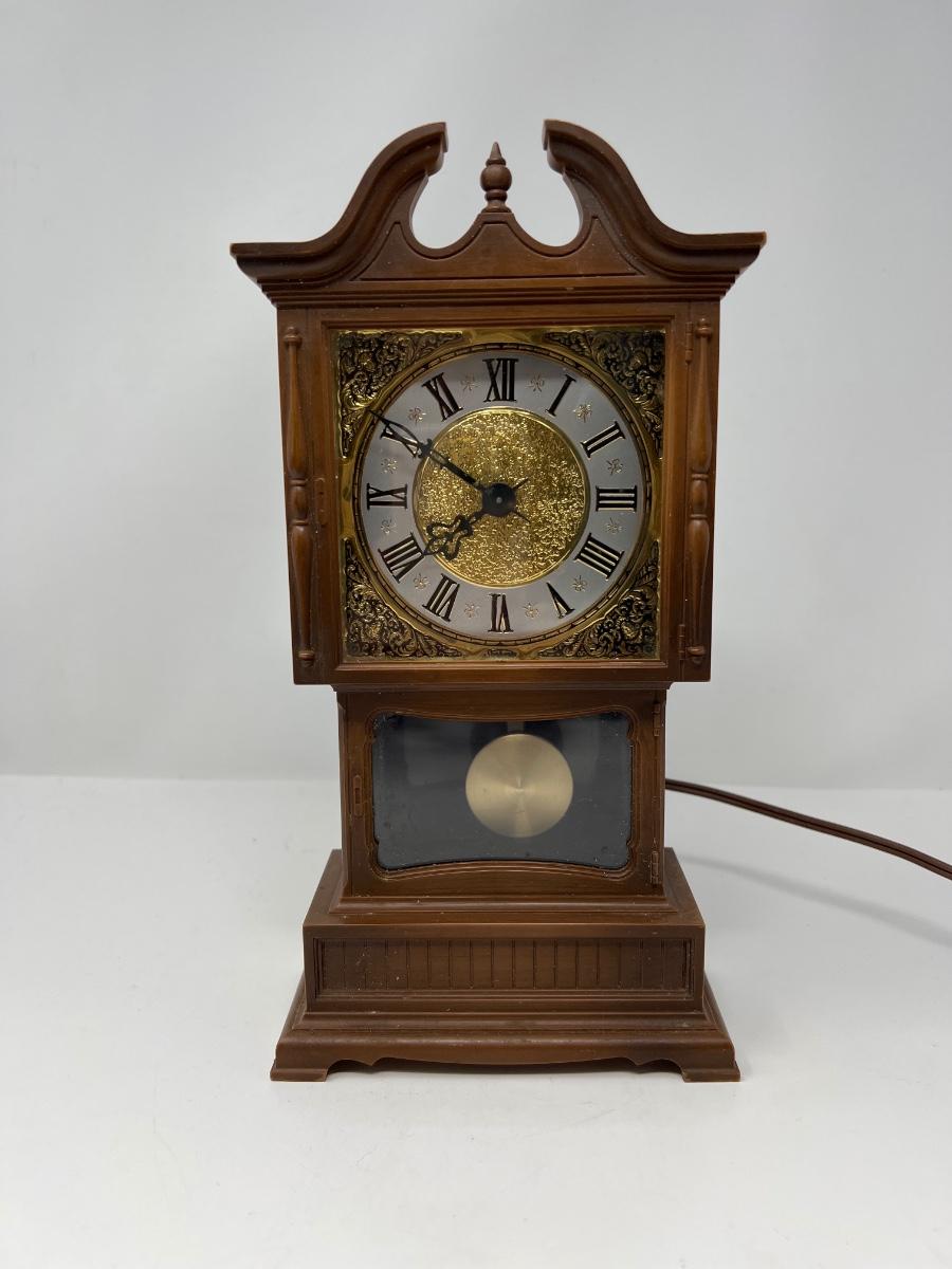 Clock stands 10” tall x 5” wide x 2.5” deep; it is made in Chicago by Sunbeam Electric Company. Uses electricity to run. Powers on. Hands can be moved to change time by using knob in back. Pendulum swings when operating.