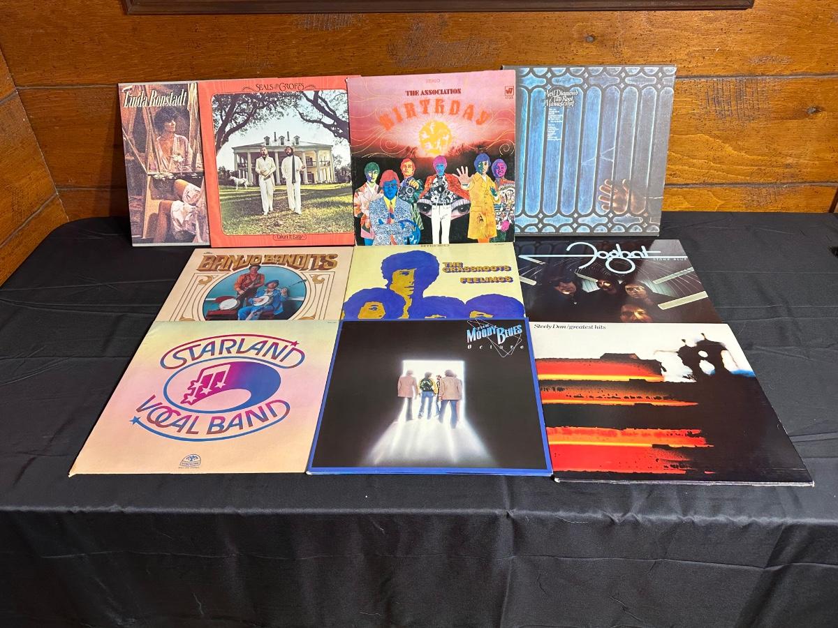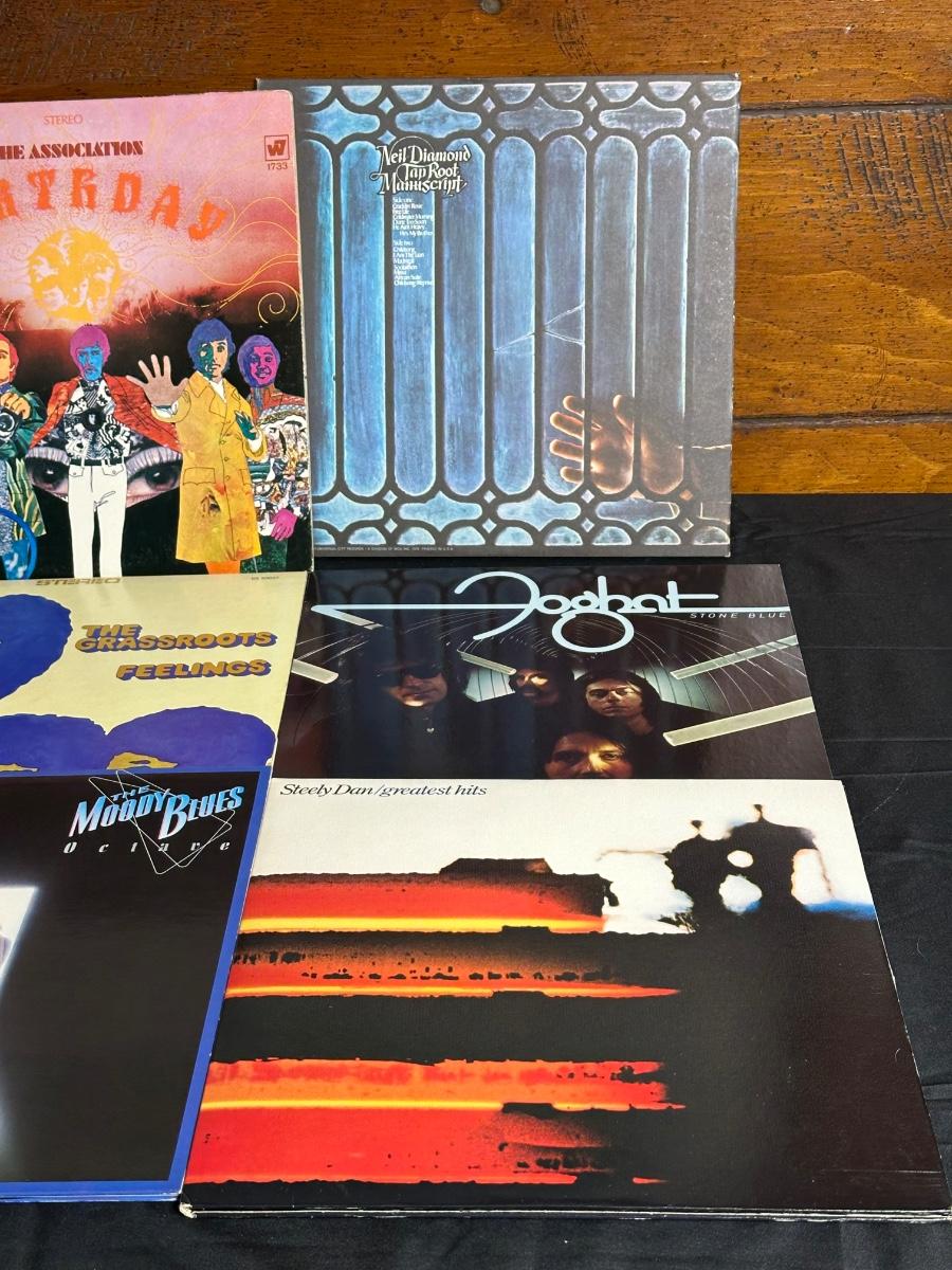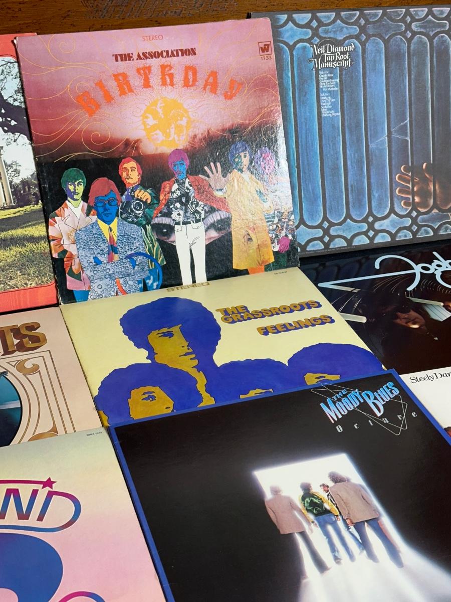 Records including/by The Grassroots, Linda Ronstadt, Banjo Bandits, Steely Dan, Foghat, and the Associations.