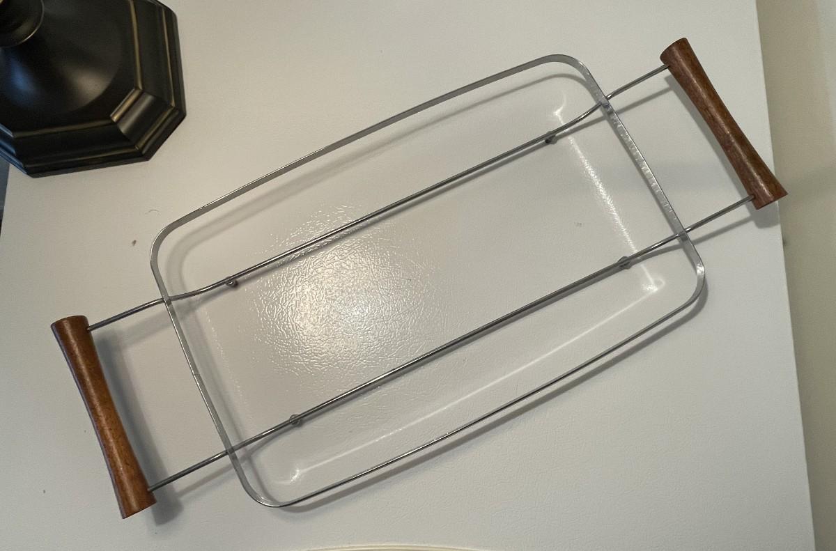 This tray is about 16 inches by 10.25 inches with the serving rack. This tray is in excellent condition with the only signs of use being very faint and small surface scratches.