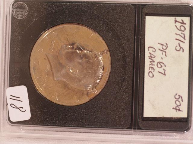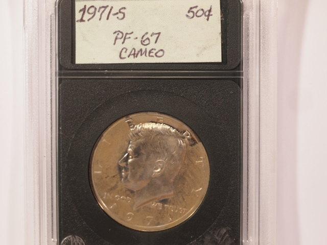 1971 S Kennedy Half Dollar slabbed in PF 67 Cameo Condition very Nice Coin Very collectible Peace of History. Great for the First time or even the seasoned Collector Lots of lusted and a mirror like finish Makes these a great addition to your Collection,