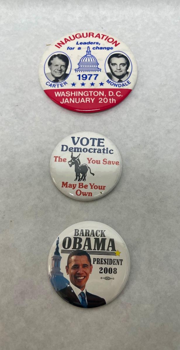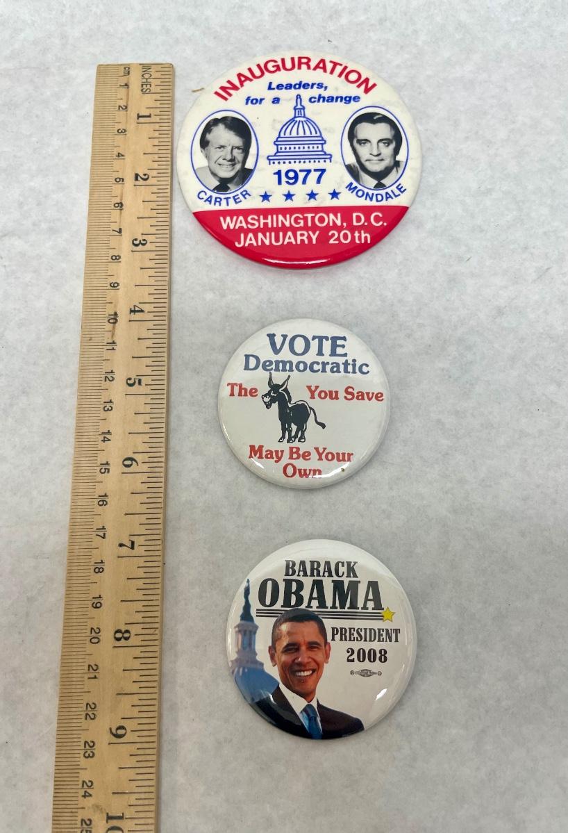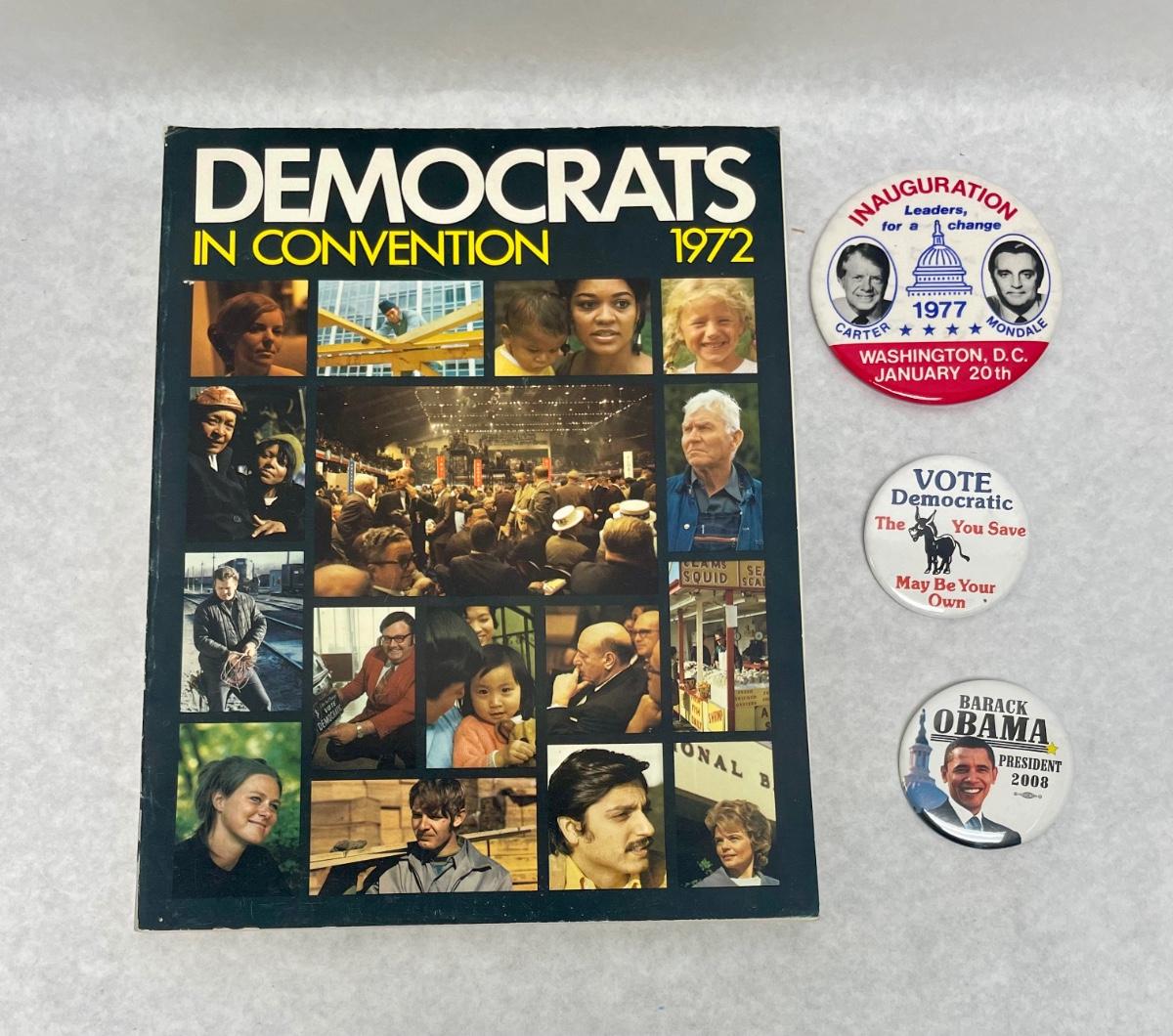 Convention program and buttons are in excellent condition. Campaign-style buttons for 1977 inauguration of Carter/Mondale, an undated Vote Democratic button, and a 2008 Barack Obama button. All will make an excellent addition to any collection.