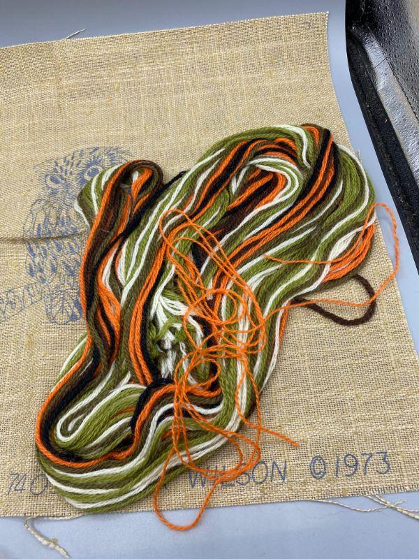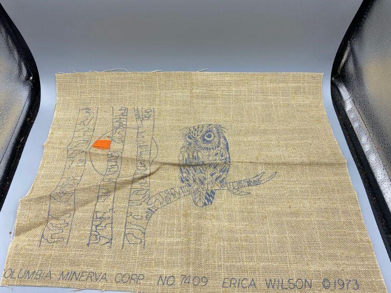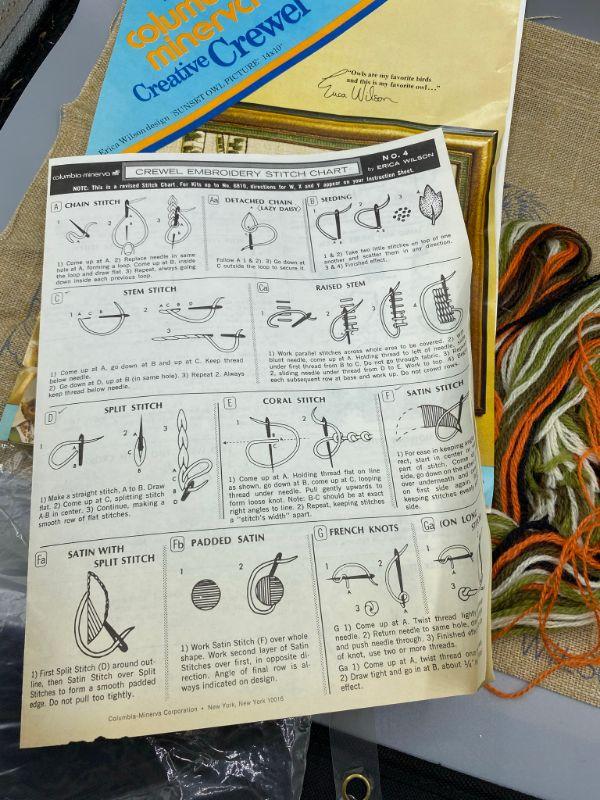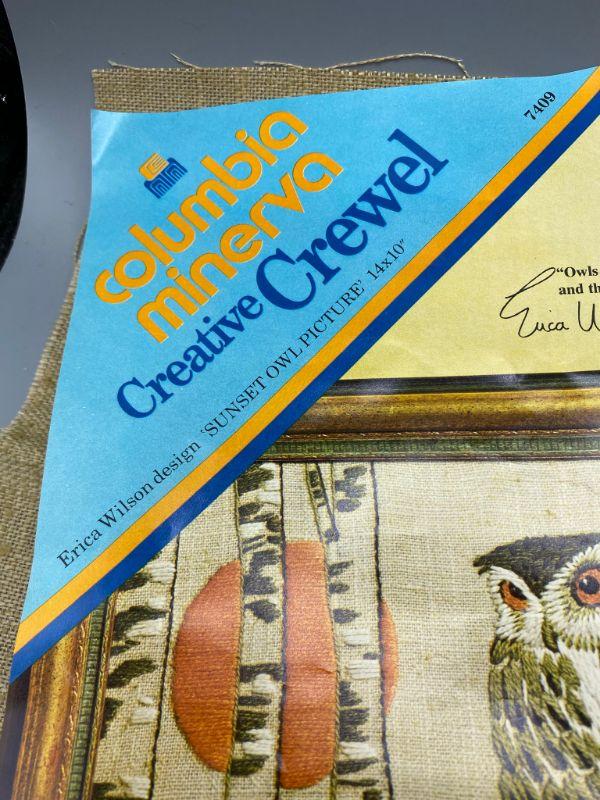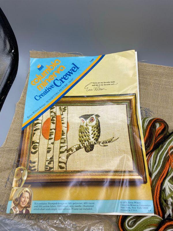 Vintage 1973 Columbia Minerva Creative Crewel kit. Sunset Owl picture #7409 is a Erica Wilson design. Measures 14"x10". Package is opened and someone stitched a few stitches in the sun. Looks to be complete.