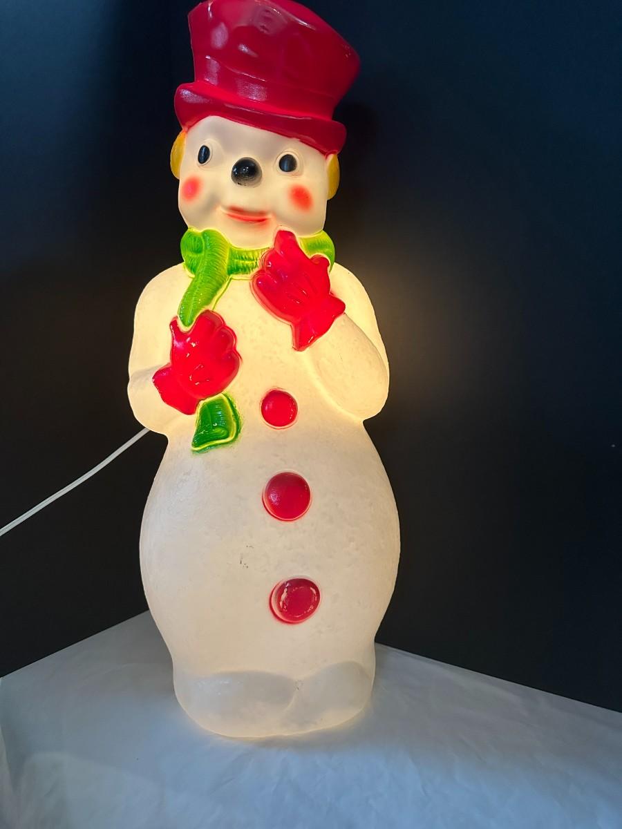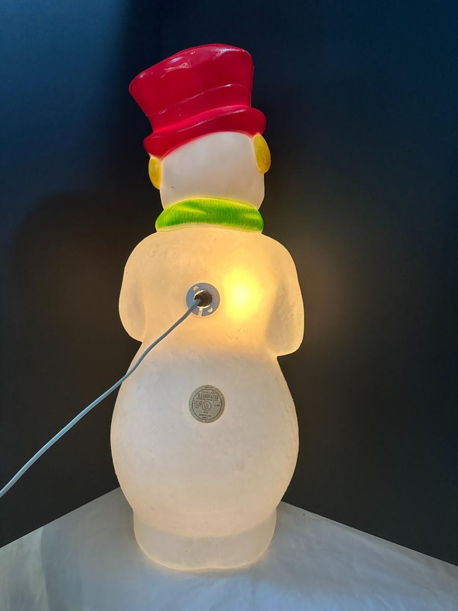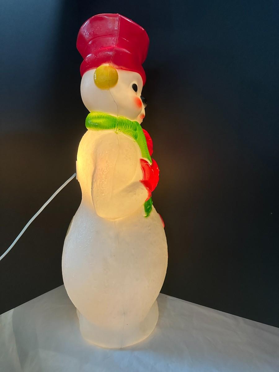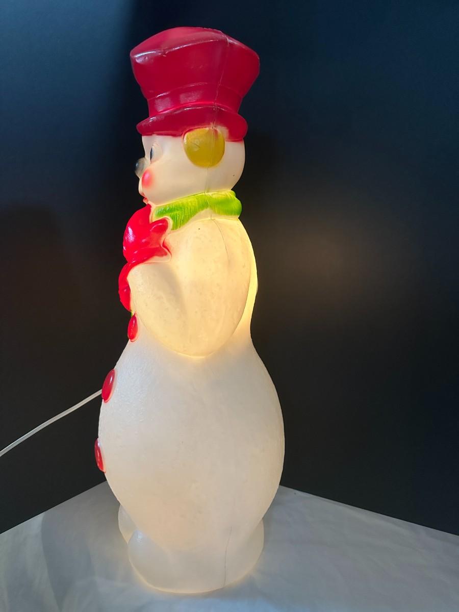 Rare to find a 1973 Jolly Snowman in this good of condition. Still bright with cord and light. Stands 22" tall. Companion to 1973 Jolly Santa also in auction.