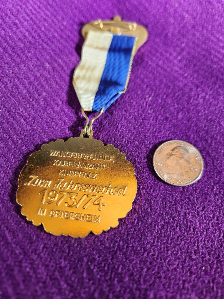 This auction lot is for a GERMAN VOLKSMARCH MEDAL This medal is from the 1973/74 New Year's Oftersheim March.