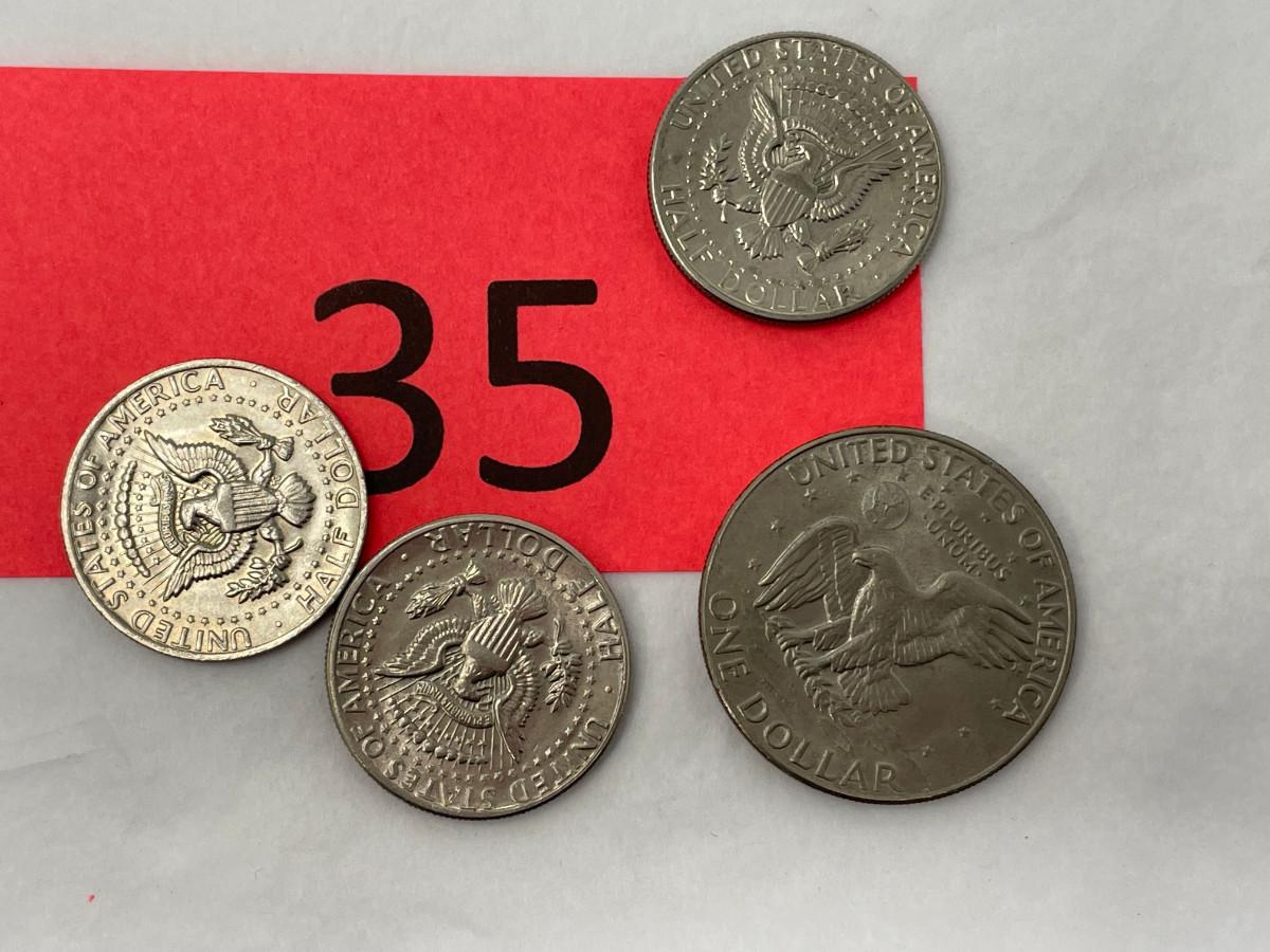 3 Kennedy 1/2 Dollars & one Ike dollar