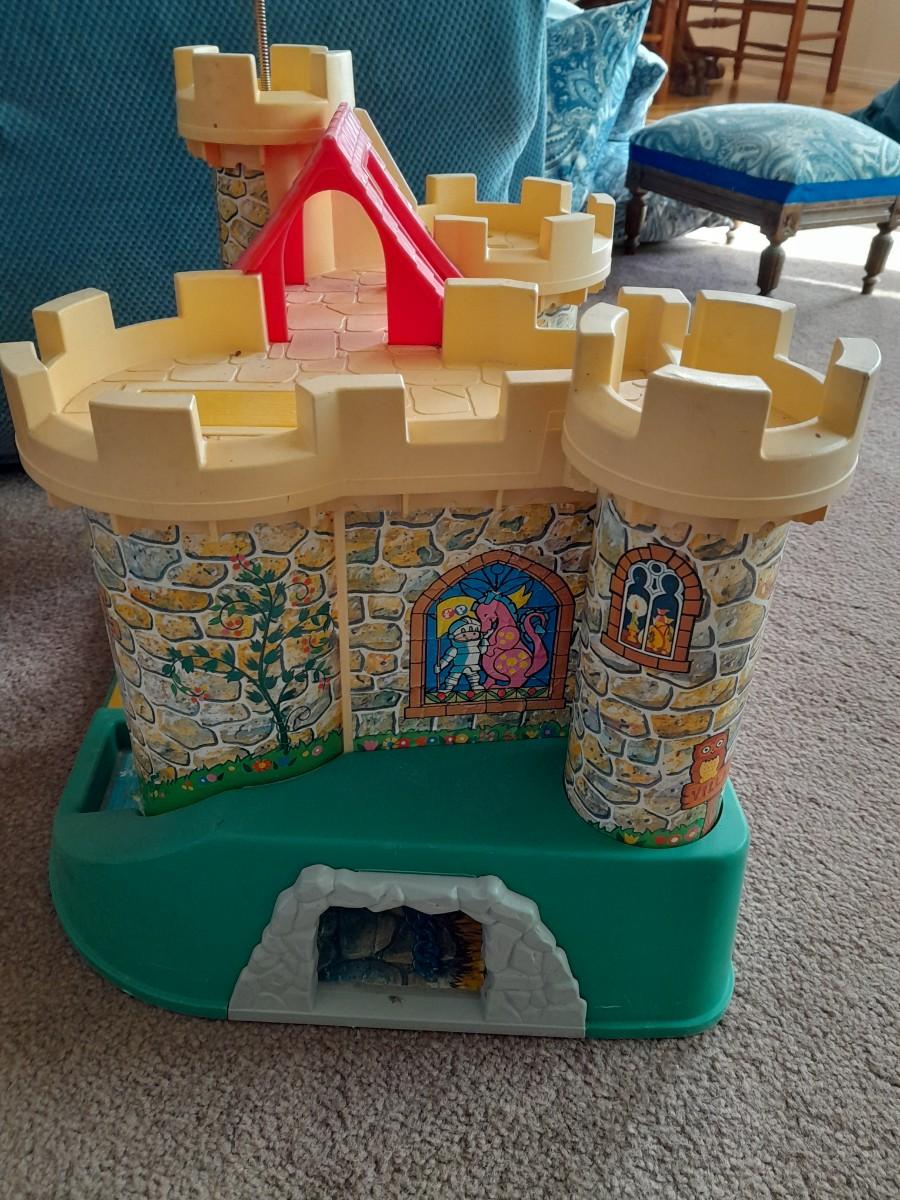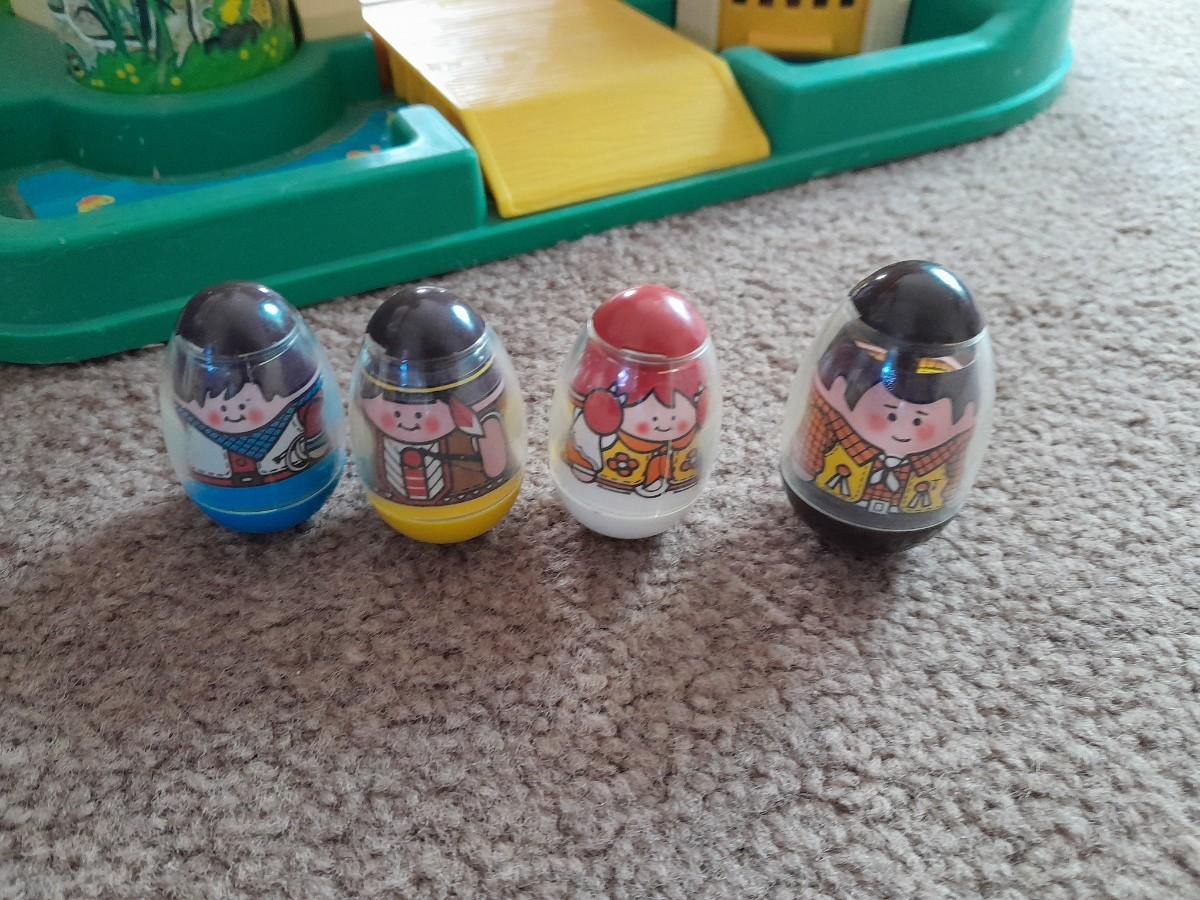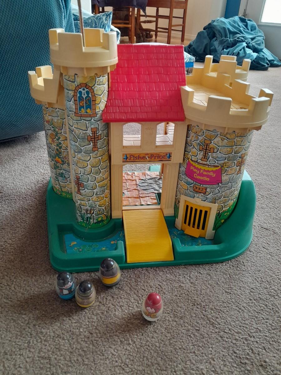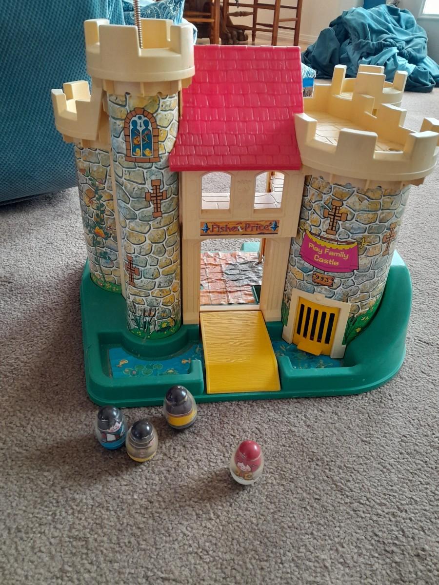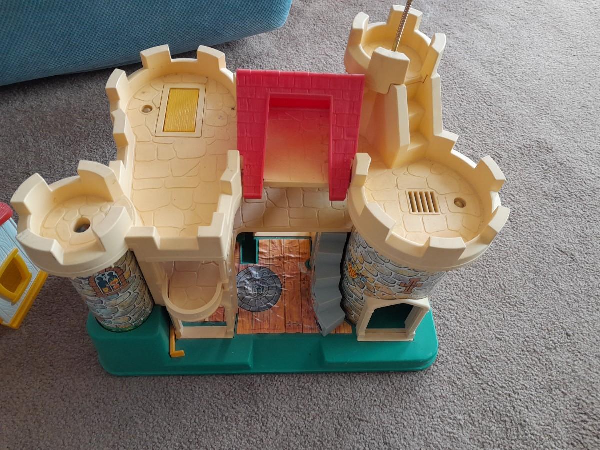 1974 FISHER PRICE PLAY CASTLE 993 WITH FOUR VINTAGE WEEBLE LIKE CHARACTERS.