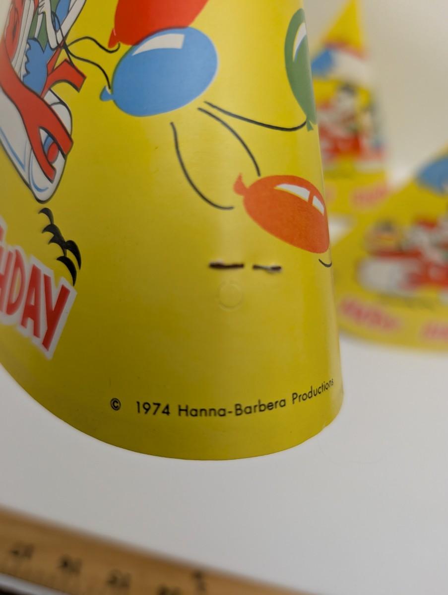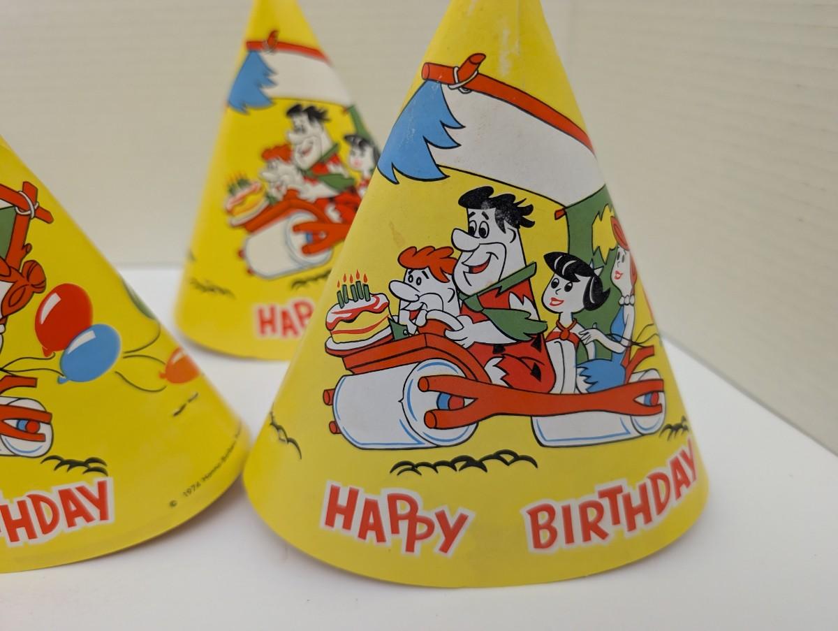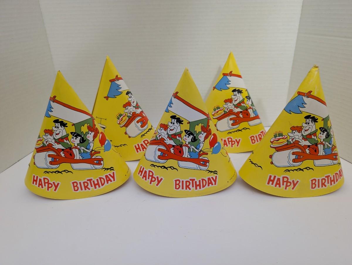 hanna barbera, flintstones, vintage party hats, 1970s birthday, retro decorations, cartoon collectibles, fred flintstone, barney rubble, vintage paper goods, animation memorabilia, 1974 collectible, birthday decor, vintage cartoon, classic tv show, flintstones merchandise