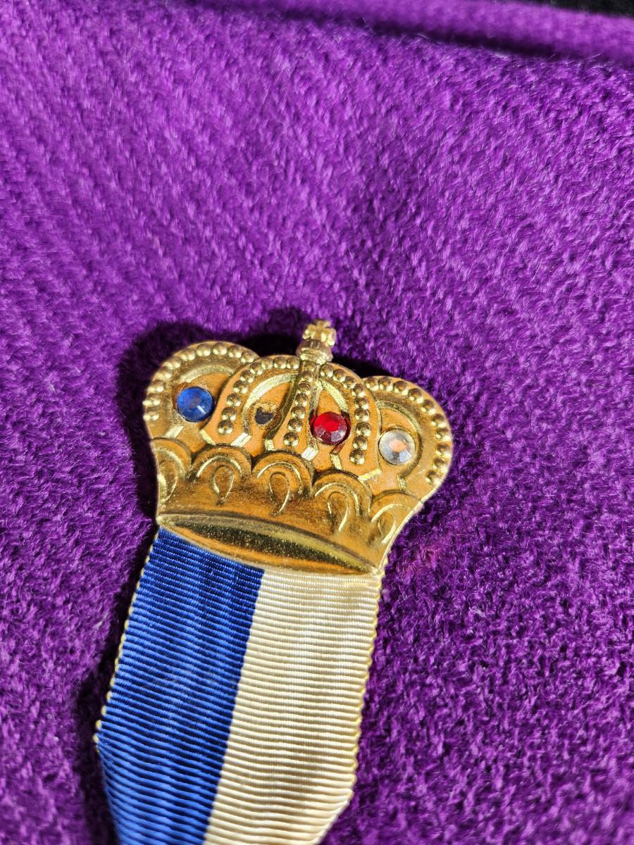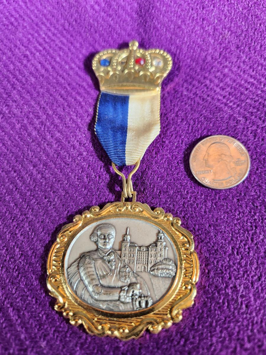 This auction lot is for a GERMAN VOLKSMARCH MEDAL This medal is from the 1974 Oftersheim March. Note: one of the costume gems is missing from the crown - see photo.