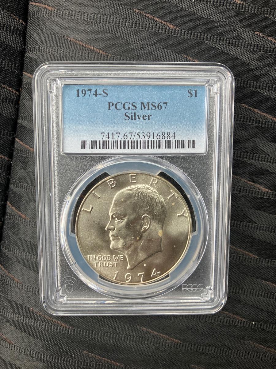 The 1974-S silver Ikes had a mintage of about 1.9 million in the silver-clad composition, but very few survived in true superb gem condition. In MS67, it sits near the top of the surviving population.