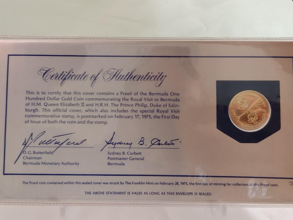 1975 Bermuda $100 Gold Coin Royal Visit with First Day Issue Stamp Proof Set 7.03 Grams 90% Fine Gold (#231)