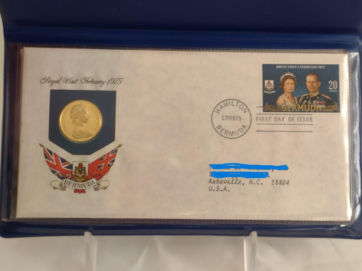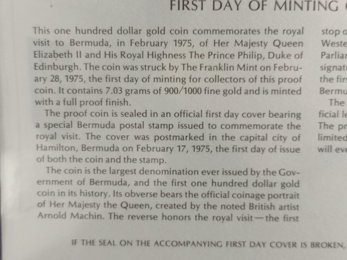 1975 Bermuda $100 Gold Coin Royal Visit with First Day Issue Stamp Proof Set 7.03 Grams 90% Fine Gold (#232)