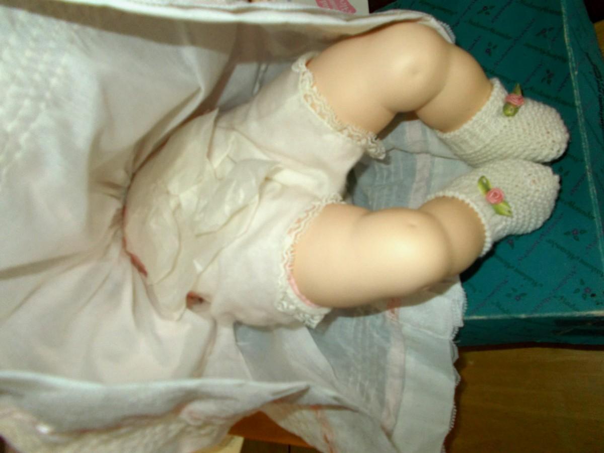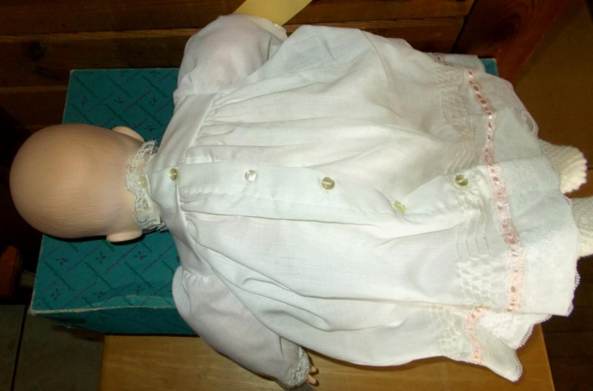This vinyl baby doll is from the 1970's. In excellent condition. No issues at all with doll. In original box which shows some wear. Has the bent knees. Her coloring is most like the first full photo. The flash washed out some of the close ups. Don't pass her up. Great for collectors or to give a child a great doll to play with.