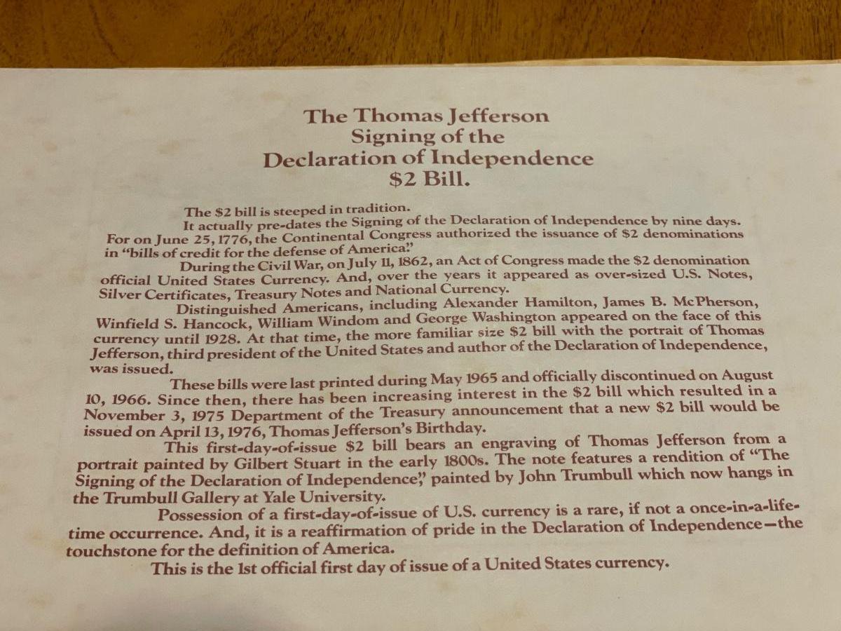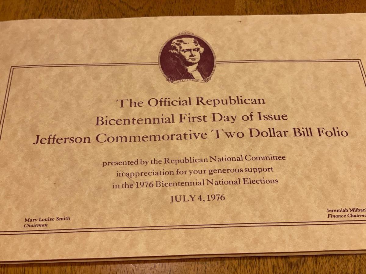 The official Republican bicentennial first day of issued Jefferson commemorative two dollar bill folio