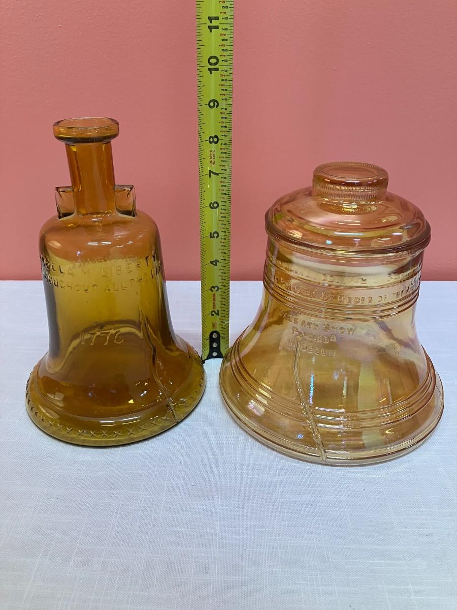 1976 Bicentennial Liberty Bell liquor decanter and cookie jar. Decanter is amber colored glass. Cookie jar is amber colored glass with an iridescent finish.