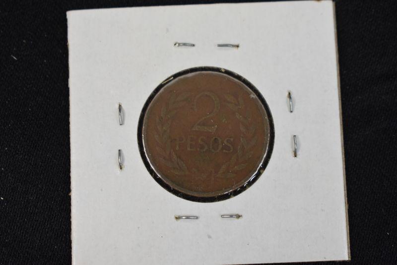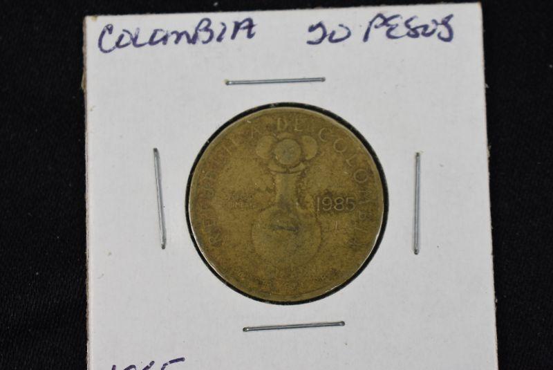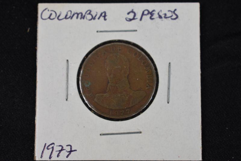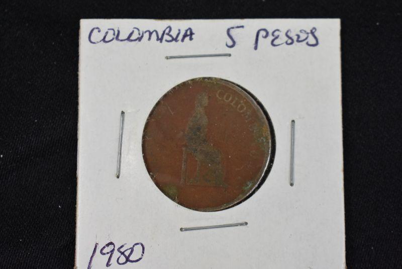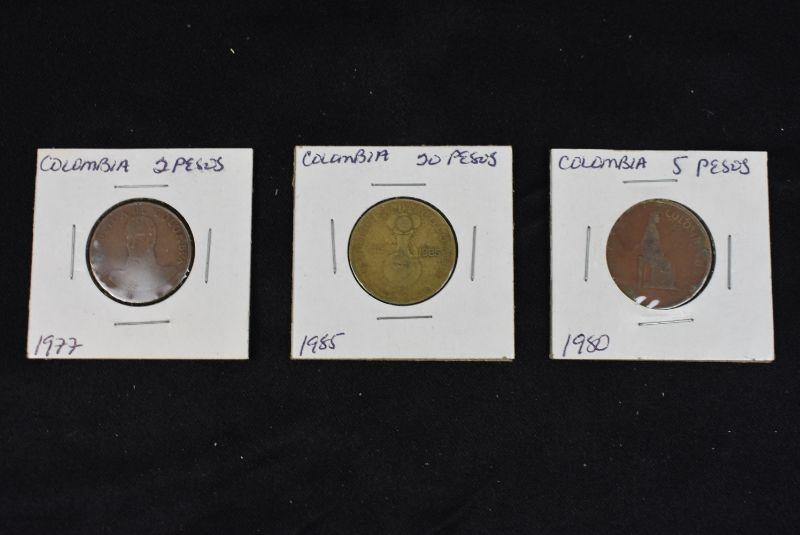 1977 Columbia 2 Pesos, 1985 Colombia 20 Pesos, and 1980 Columbia 5 Pesos