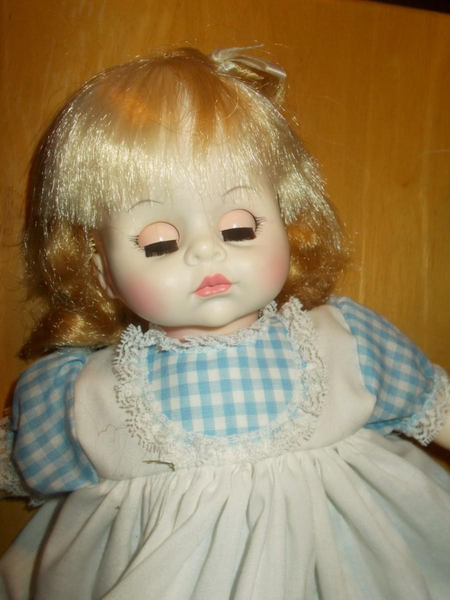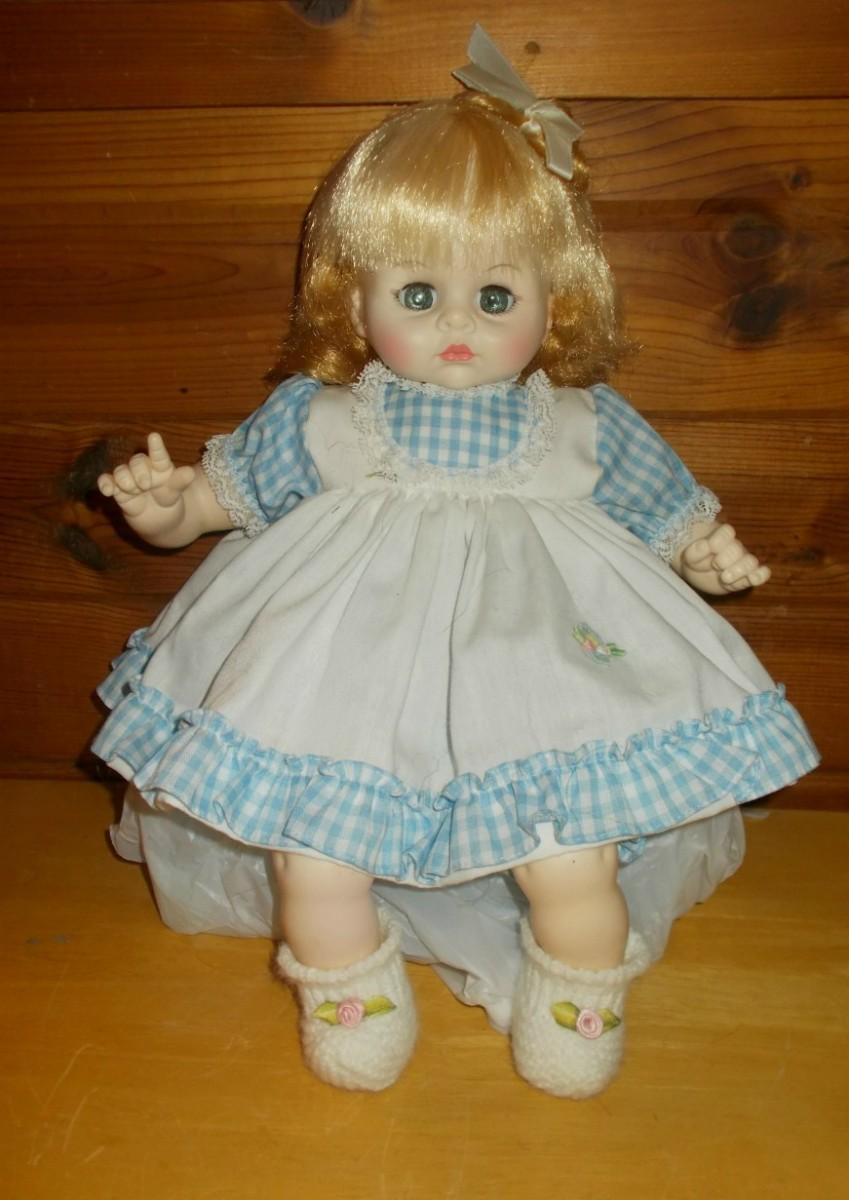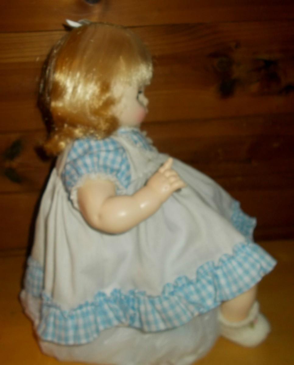 Gorgeous little doll that can be played with or adored on a shelf. She comes with her very clean and crisp blue and white gingham check original outfit. Her hair is great too. For a doll with no box, she is exceptionally clean and well cared for. She has a working crier which is rare. Don't pass her up. No box.