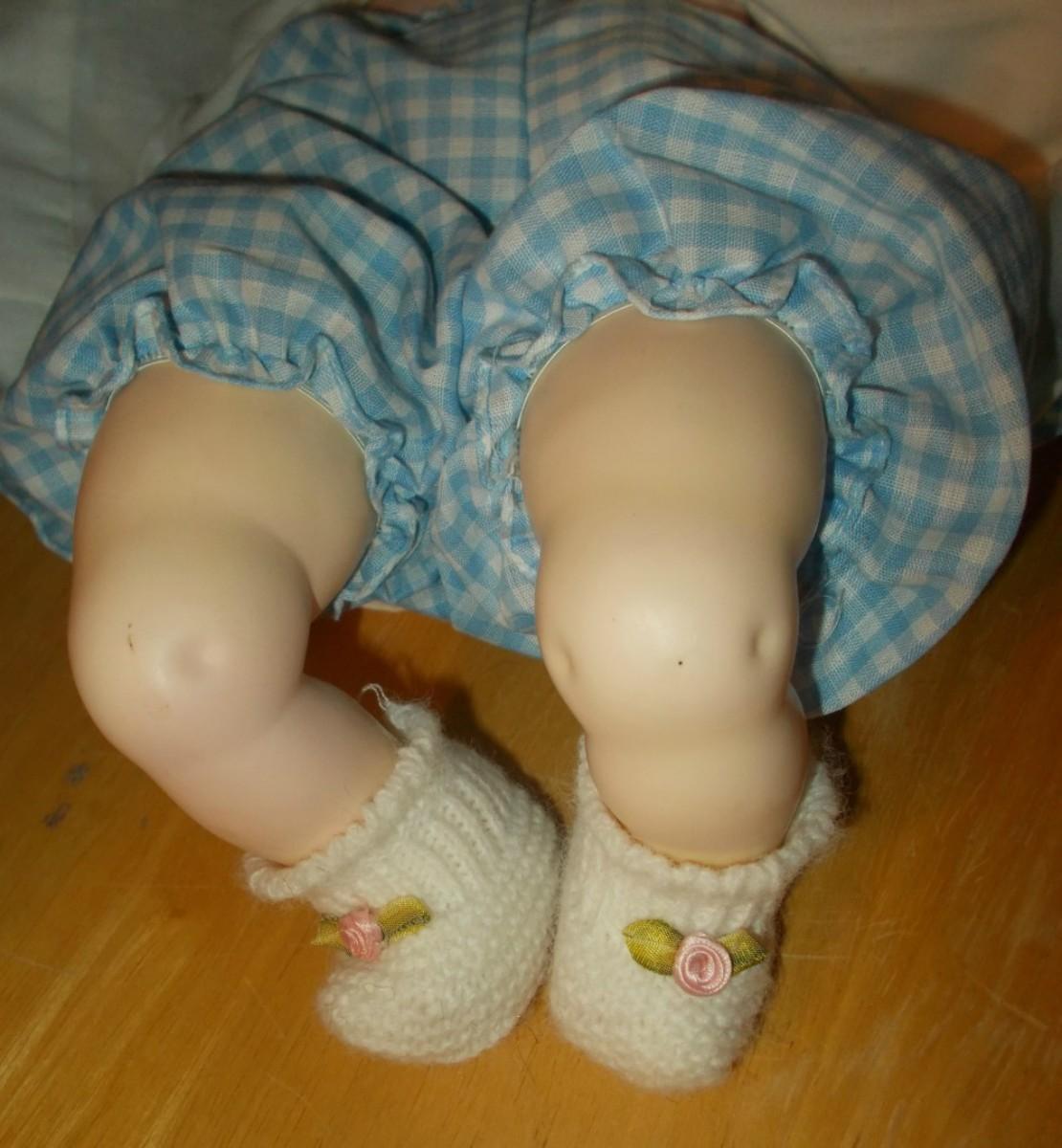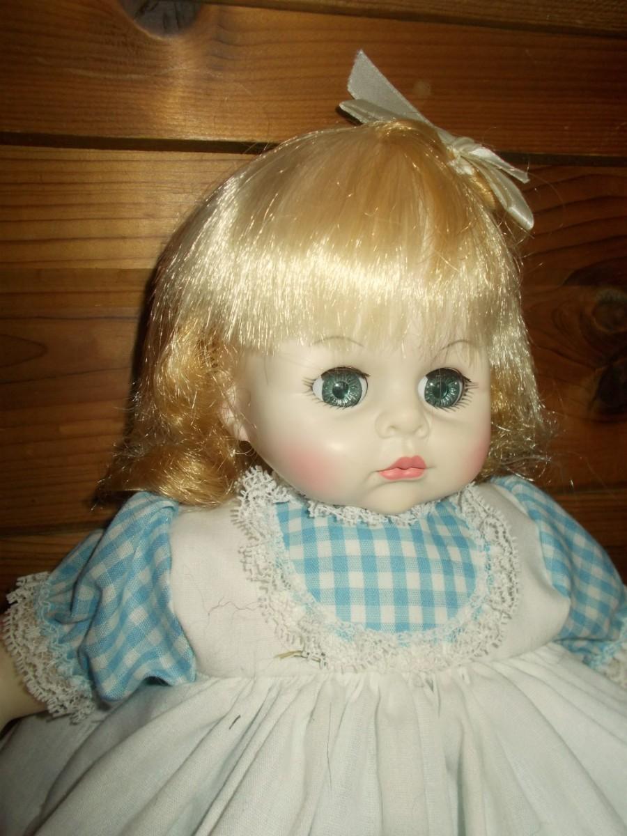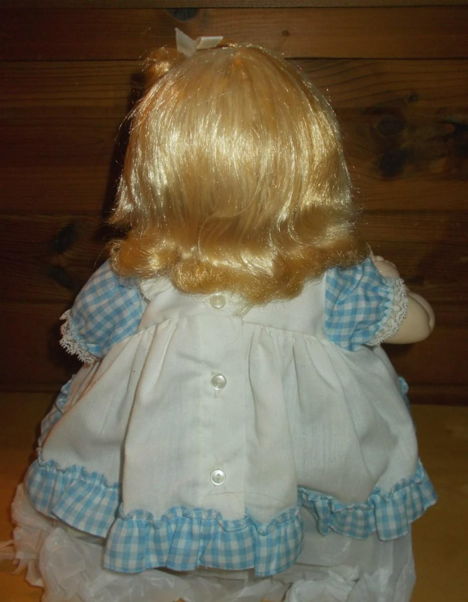 Gorgeous little doll that can be played with or adored on a shelf. She comes with her very clean and crisp blue and white gingham check original outfit. Her hair is great too. For a doll with no box, she is exceptionally clean and well cared for. She has a working crier which is rare. Don't pass her up. No box.