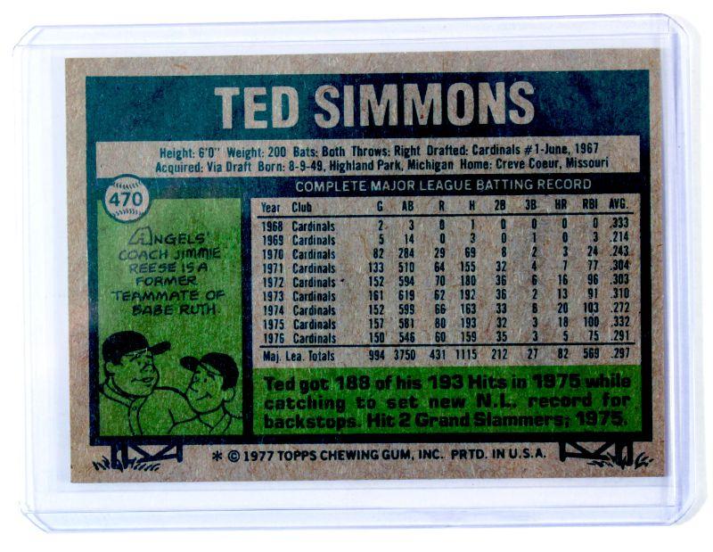 1977 TOPPS Baseball TED SIMMONS St. Louis Cardinals Baseball Card High Grade NM