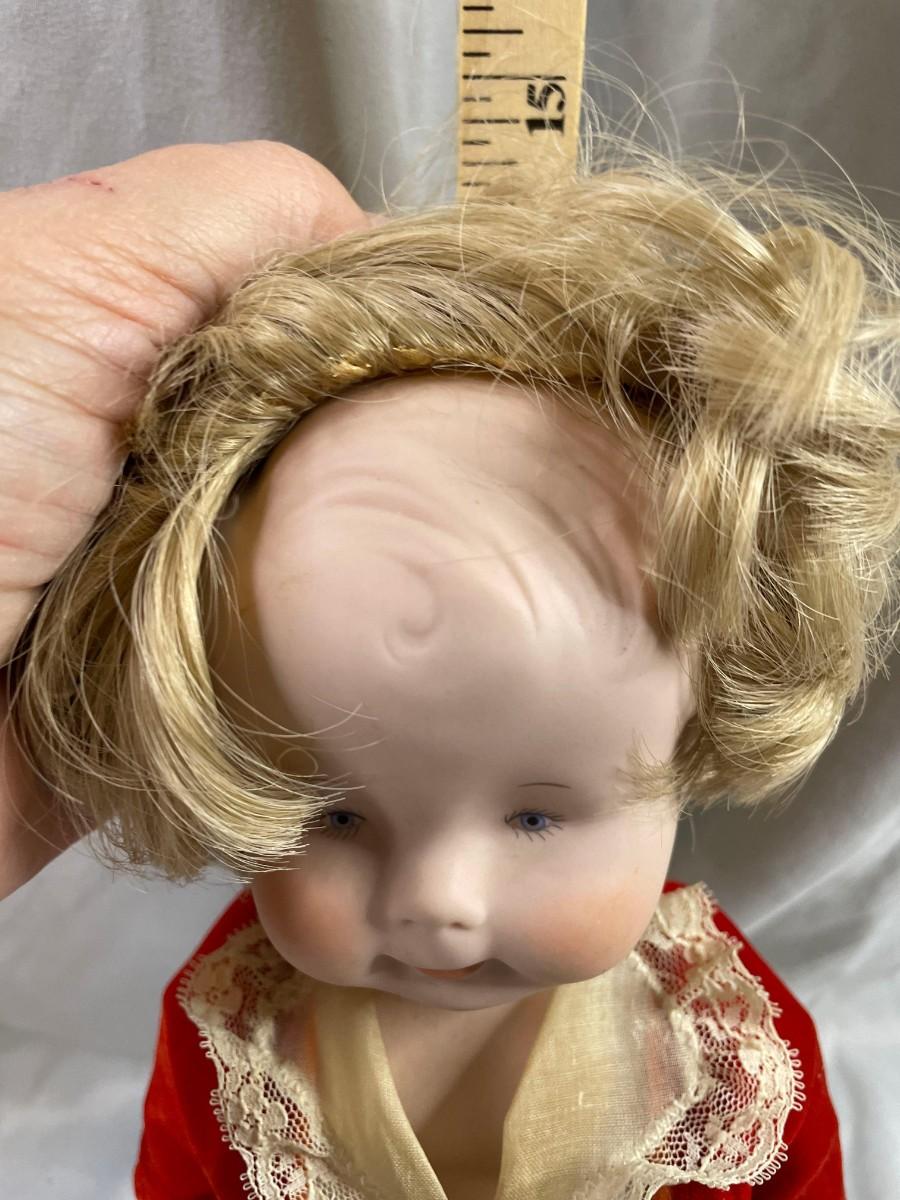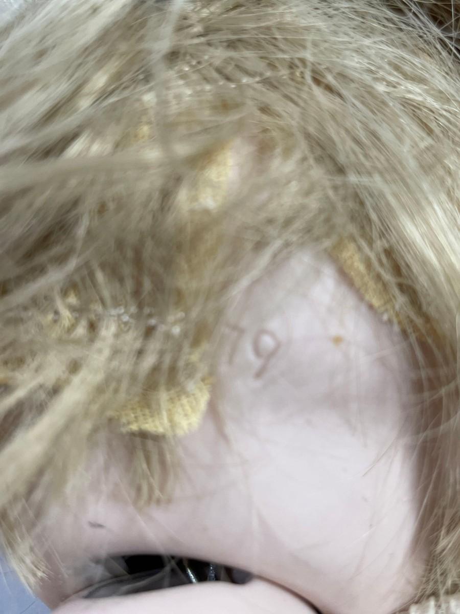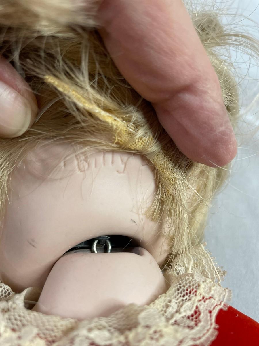 This doll is jointed and made entirely of ceramic pieces - head, arms, legs, and body are all ceramic. The hair is glued on and I did not find any issues. The head is marked Billy 1979. The stand that is supporting the doll is included.<br />