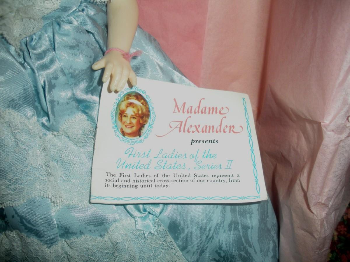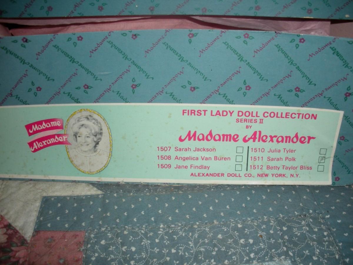 1979 Madame Alexander 14" Sarah Polk, wife of President James Polk. Part of the 2nd First Ladies Series. Made in 1979 - 1981. comes in her original box which is in good vintage condition. She has never been played with or displayed. Nice doll. She is not faded like the close up shows. that was from the flash.