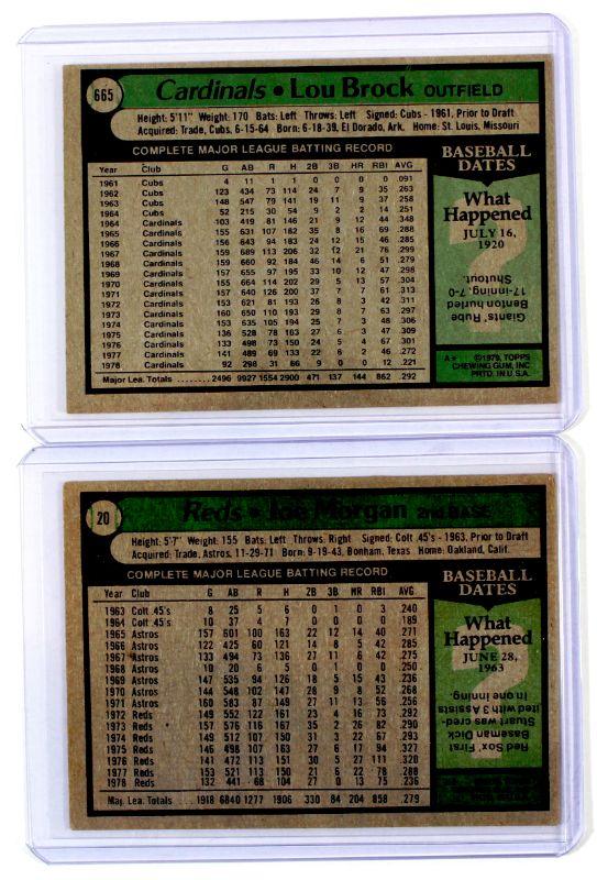 1979 TOPPS #20 JOE MORGAN #665 LOU BROCK Baseball Cards Set - High Grade