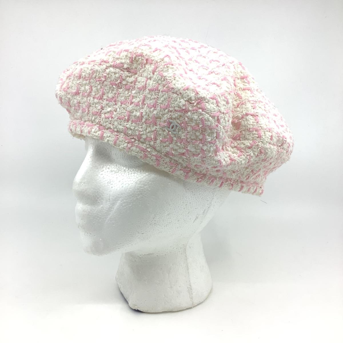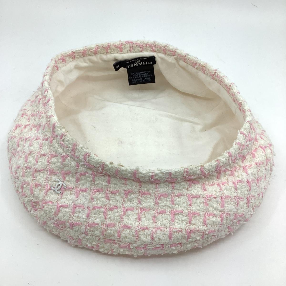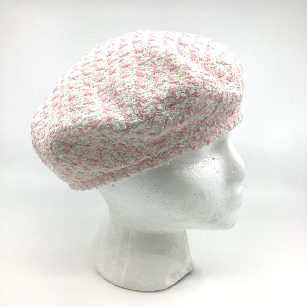 198 CHANEL Cream White & Pink Cashmere Beret Size M