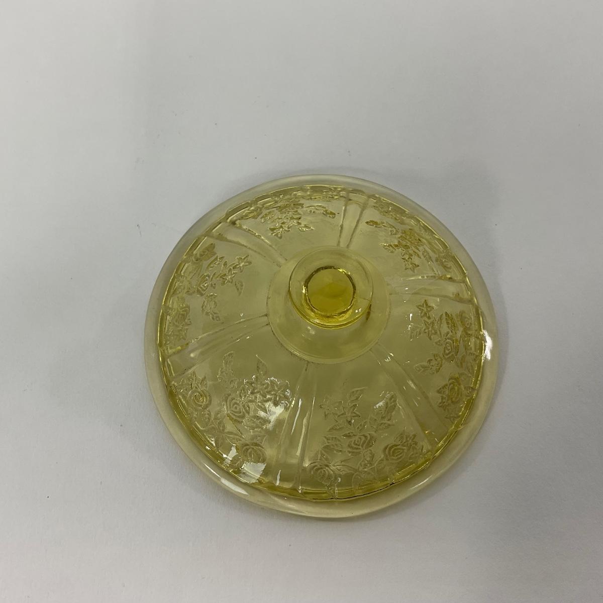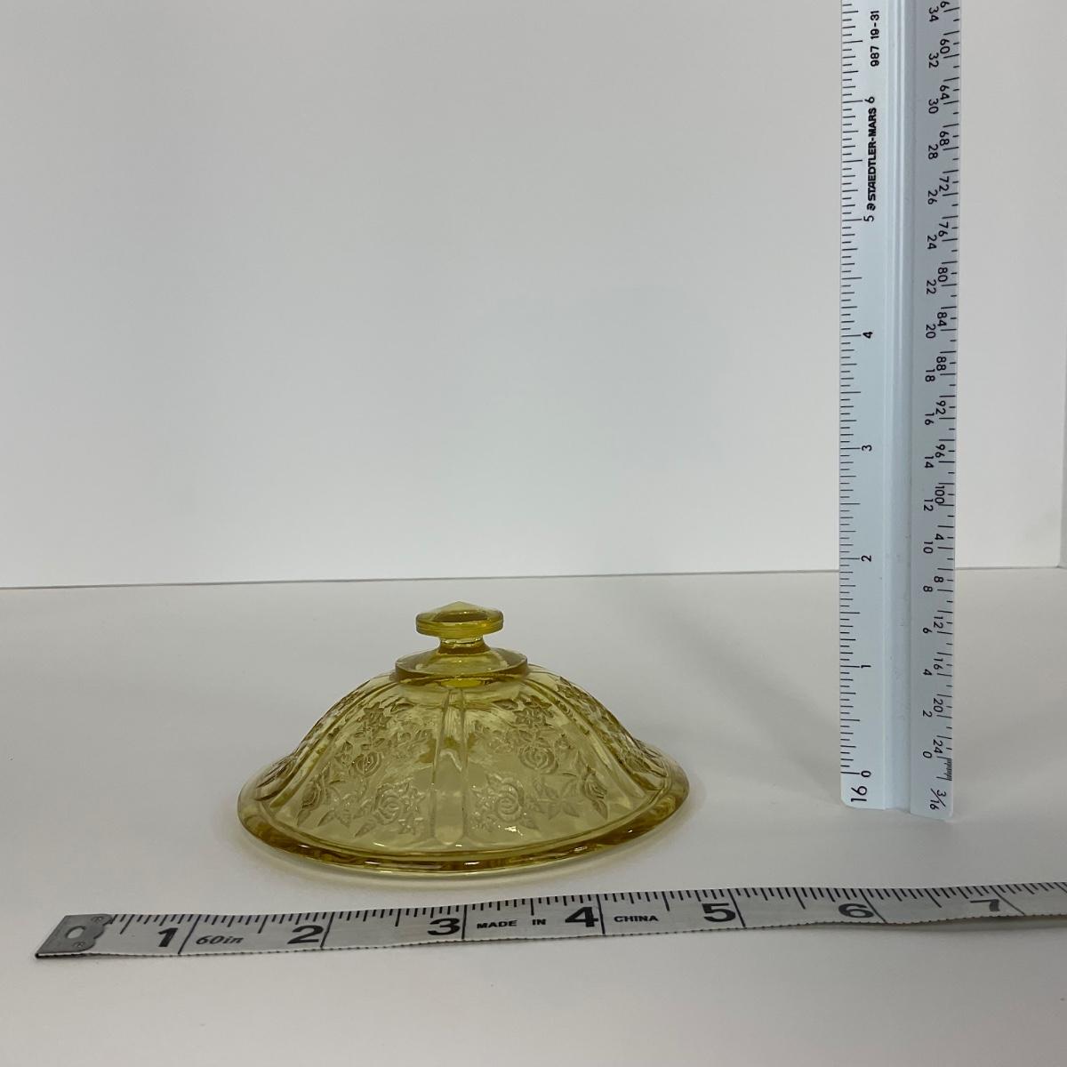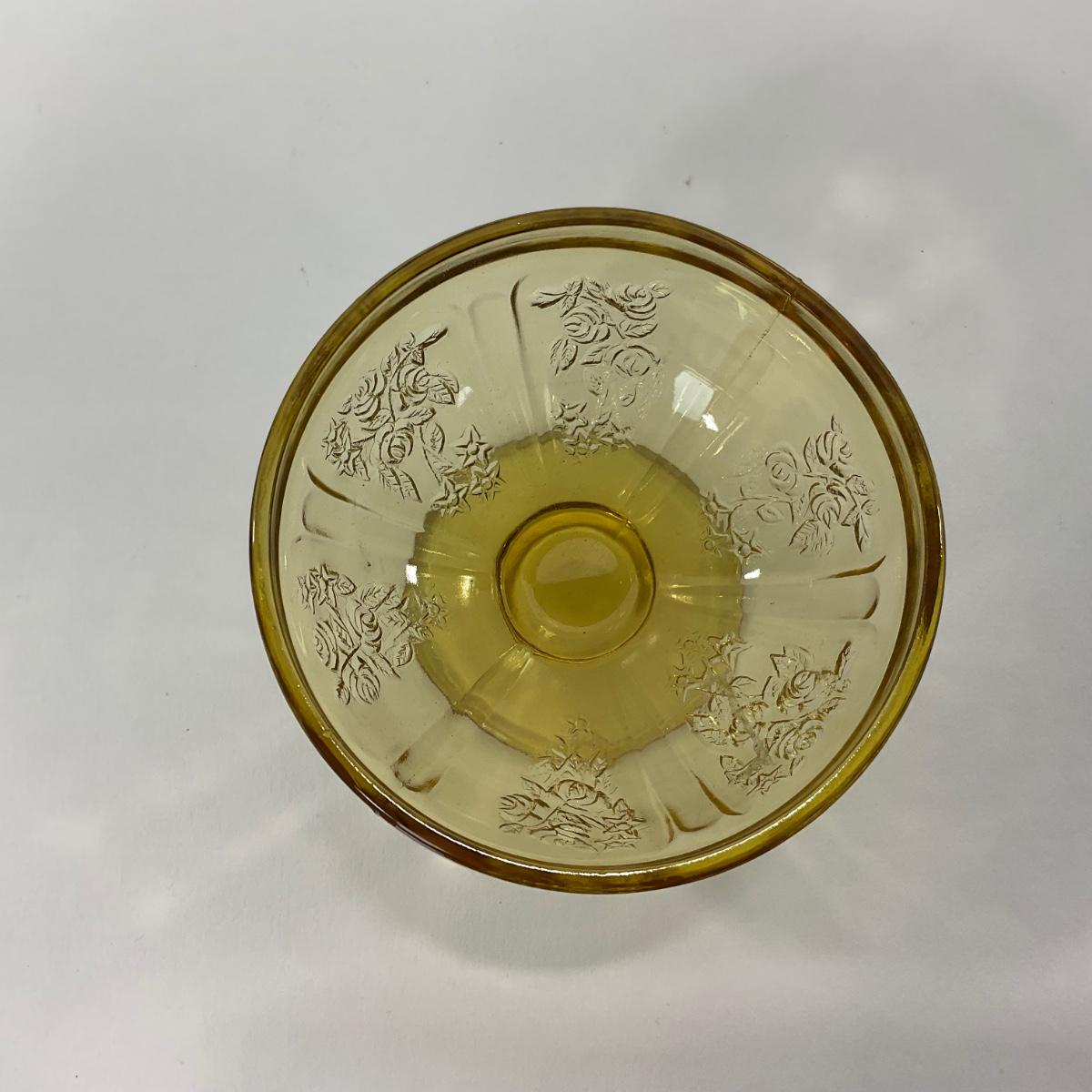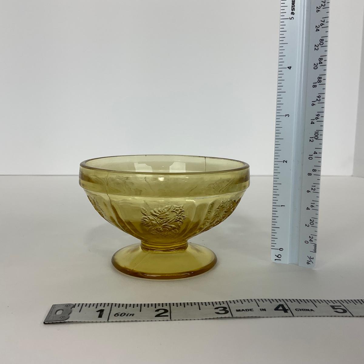 Four pieces of yellow Sharon Cabbage Rose Federal Glass Co. (1935-1939) including three sherbets and one covered sugar dish. Please see photos for details and condition. ::: Shipping is available on this lot. If you require shipping you must let us know at the close of the auction. We will coordinate with you after the item has been won. Shipping fees will include insurance up to or exceeding the value of all items being mailed. If you have any questions regarding this lot please contact the auctioneer either via this website, by direct email or by phone. PICK UP TIMES and other important information can be found in the TERMS and DESCRIPTION of the auction. Please take a look for pertinent information. Thanks!