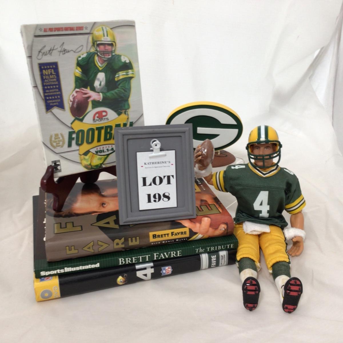 Three Brett Favre books, one action figure, one Packers emblem, and one Brett Favre DVD. Please see photos for details and condition. ::: Shipping is available on this lot. If you require shipping you must let us know at the close of the auction. We will coordinate with you after the item has been won. Shipping fees will include insurance up to or exceeding the value of all items being mailed. If you have any questions regarding this lot please contact the auctioneer either via this website, by direct email or by phone. PICK UP TIMES and other important information can be found in the TERMS and DESCRIPTION of the auction. Please take a look for pertinent information. Thanks!