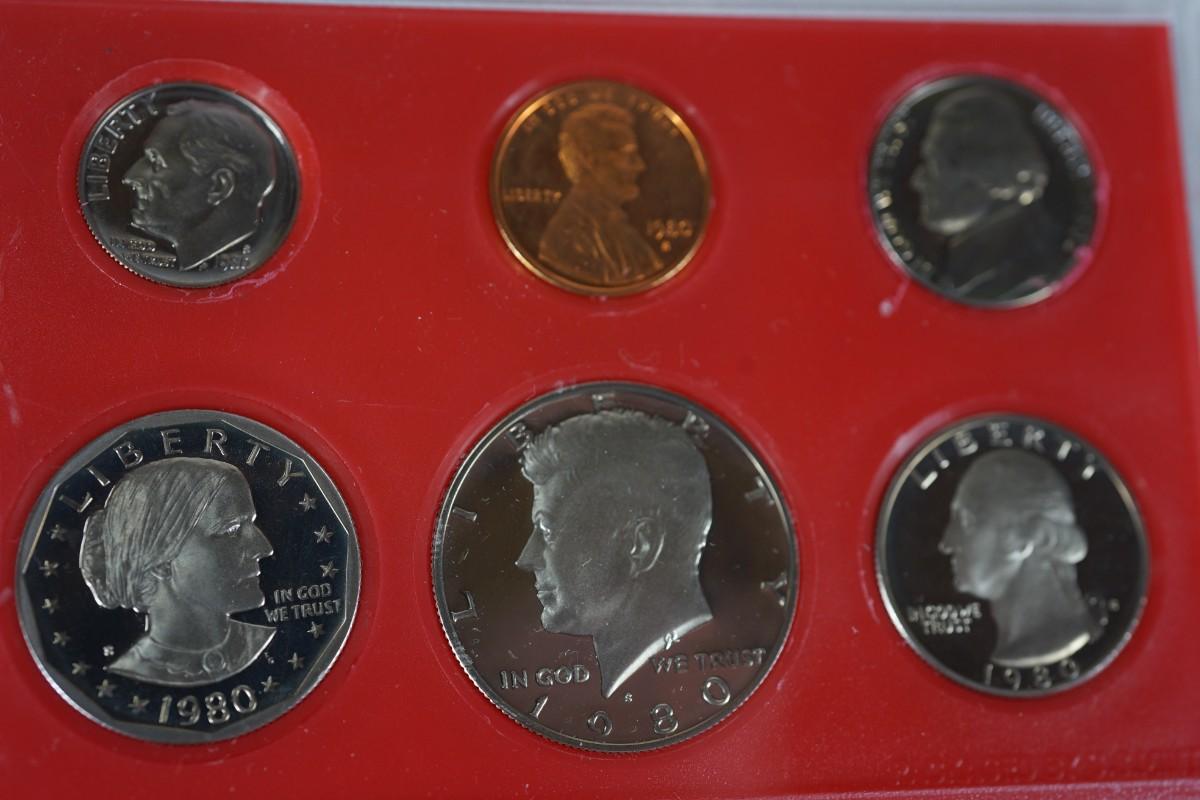 1980 six coins Kennedy half dollar, Susan B Anthony dollar coin plus