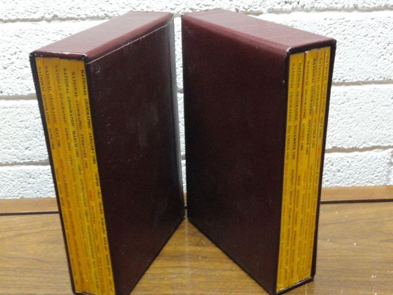 1980 National Geographic Magazine - complete set of 12 with faux leather cases Cases in great condition Books in normal good condition