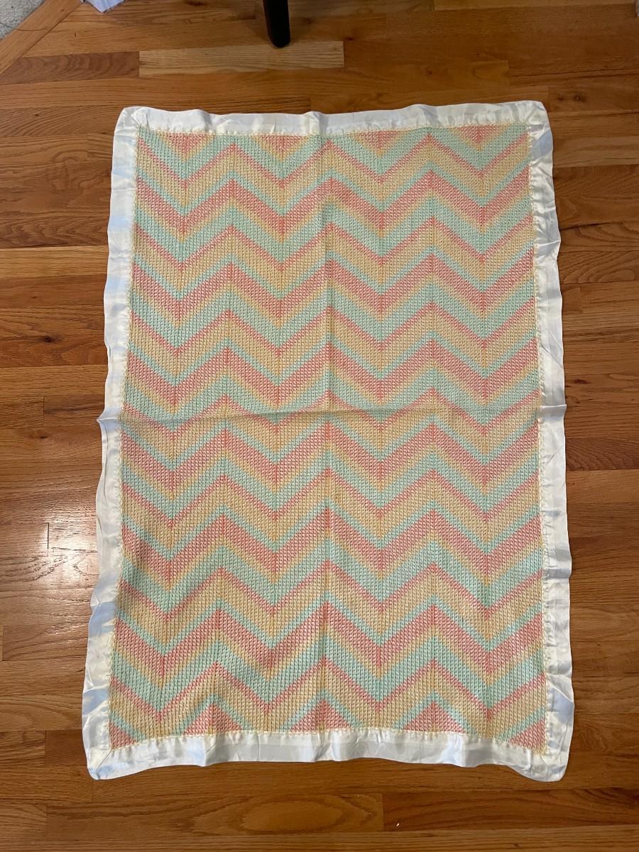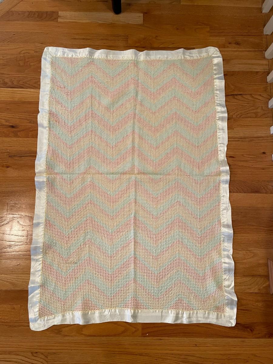 This blanket is about 49 inches long and 34 inches wide. It was made by the consignor's friend as a gift for the consignor's daughter. It is woven in monks cloth and finished with a satin edge. It is in excellent condition.