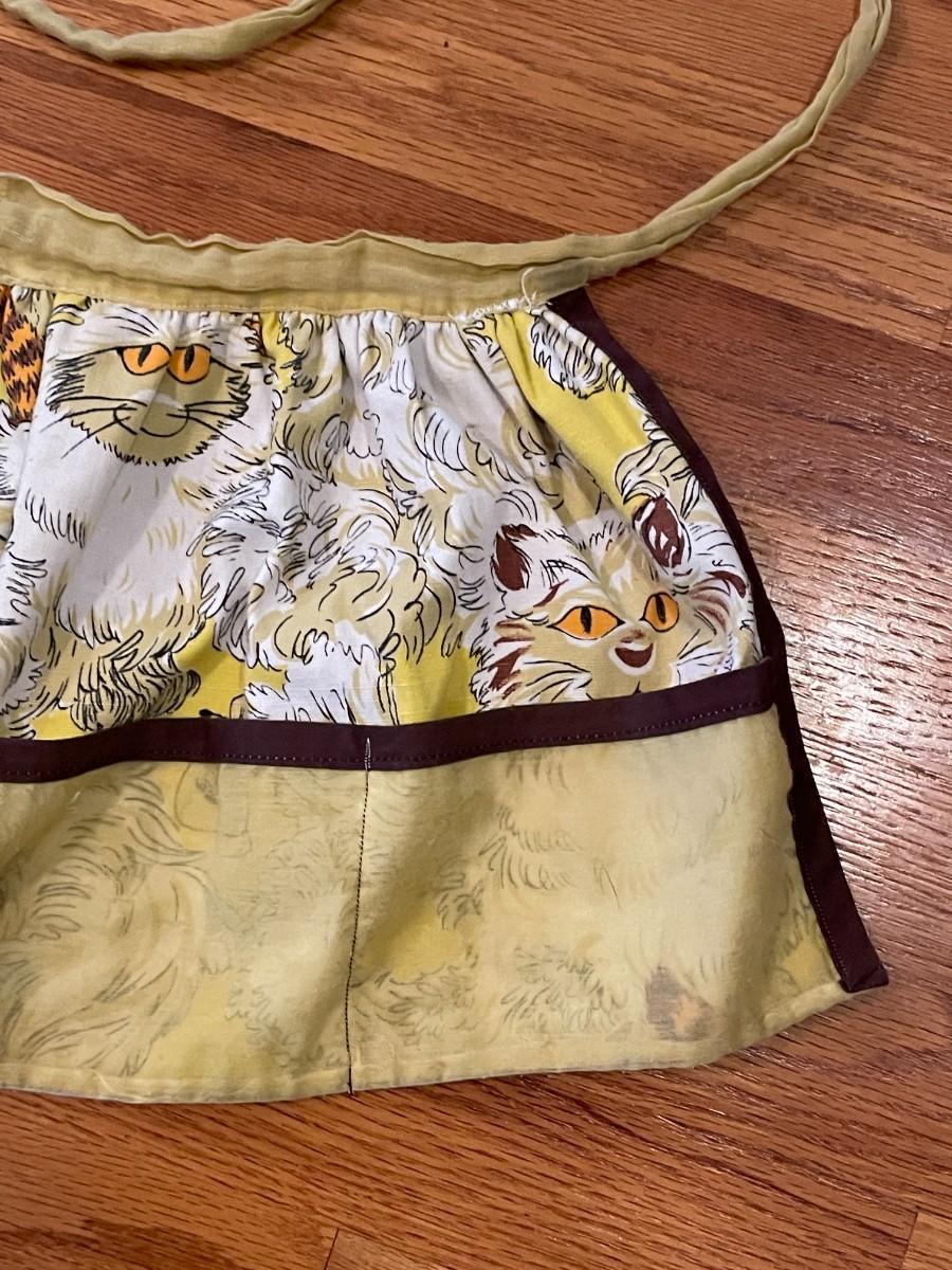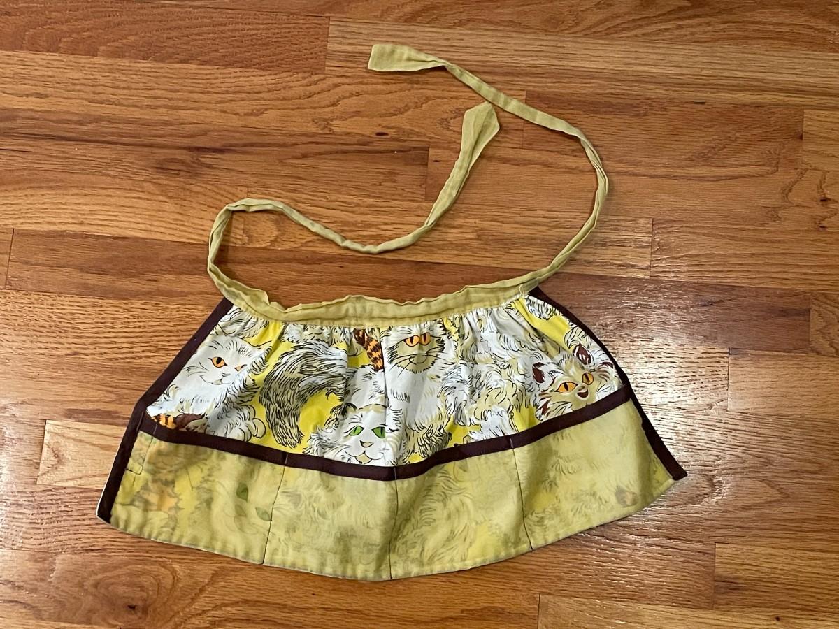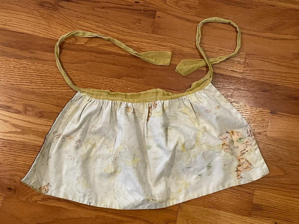 The consignor's mother-in-law made this for the consignor's daughter when she was a little girl. The waist is 44 inches from end to end and the apron is 10 inches long. The pockets on the front are somewhat sheer so that you can see the main pattern underneath.