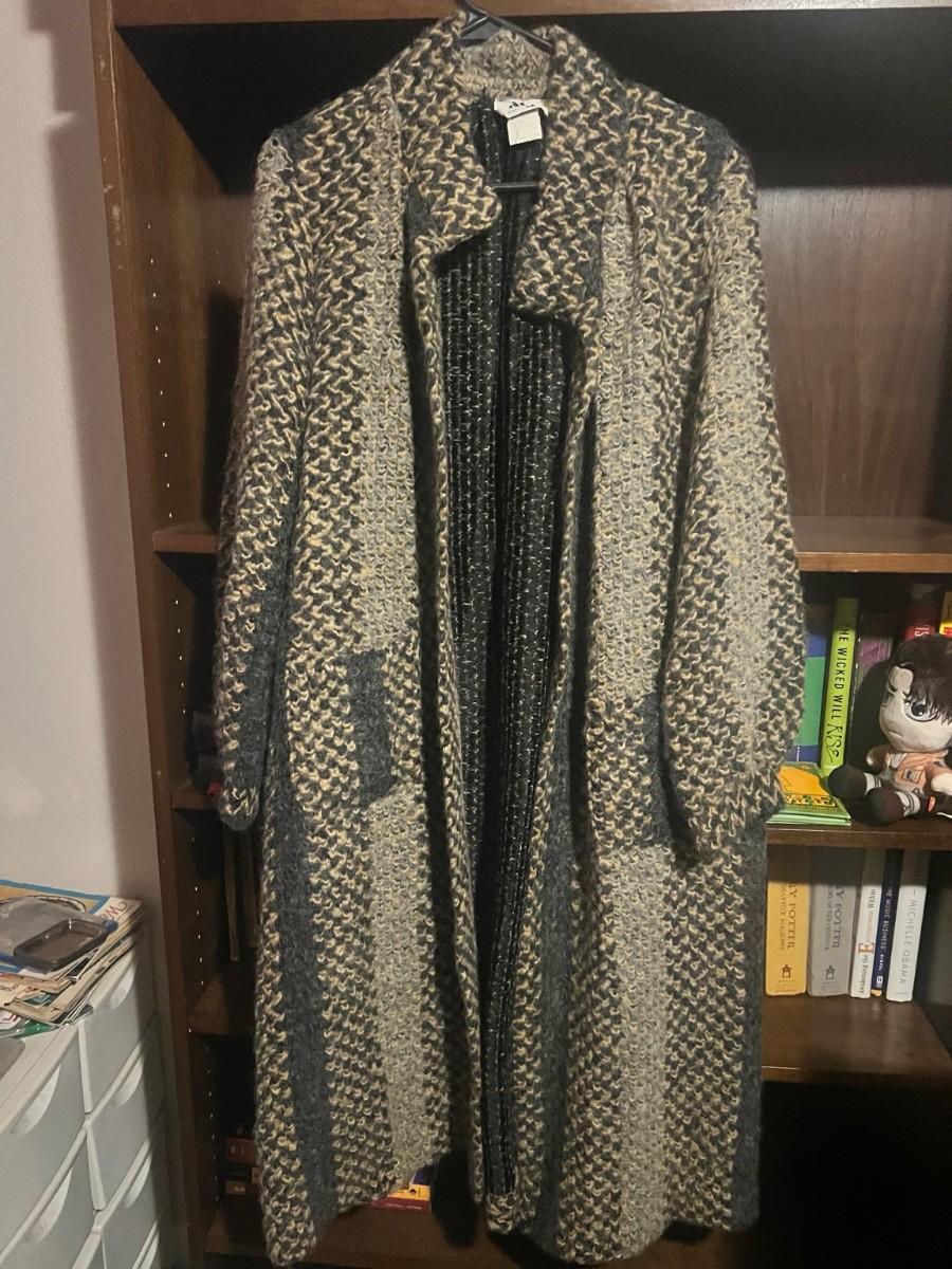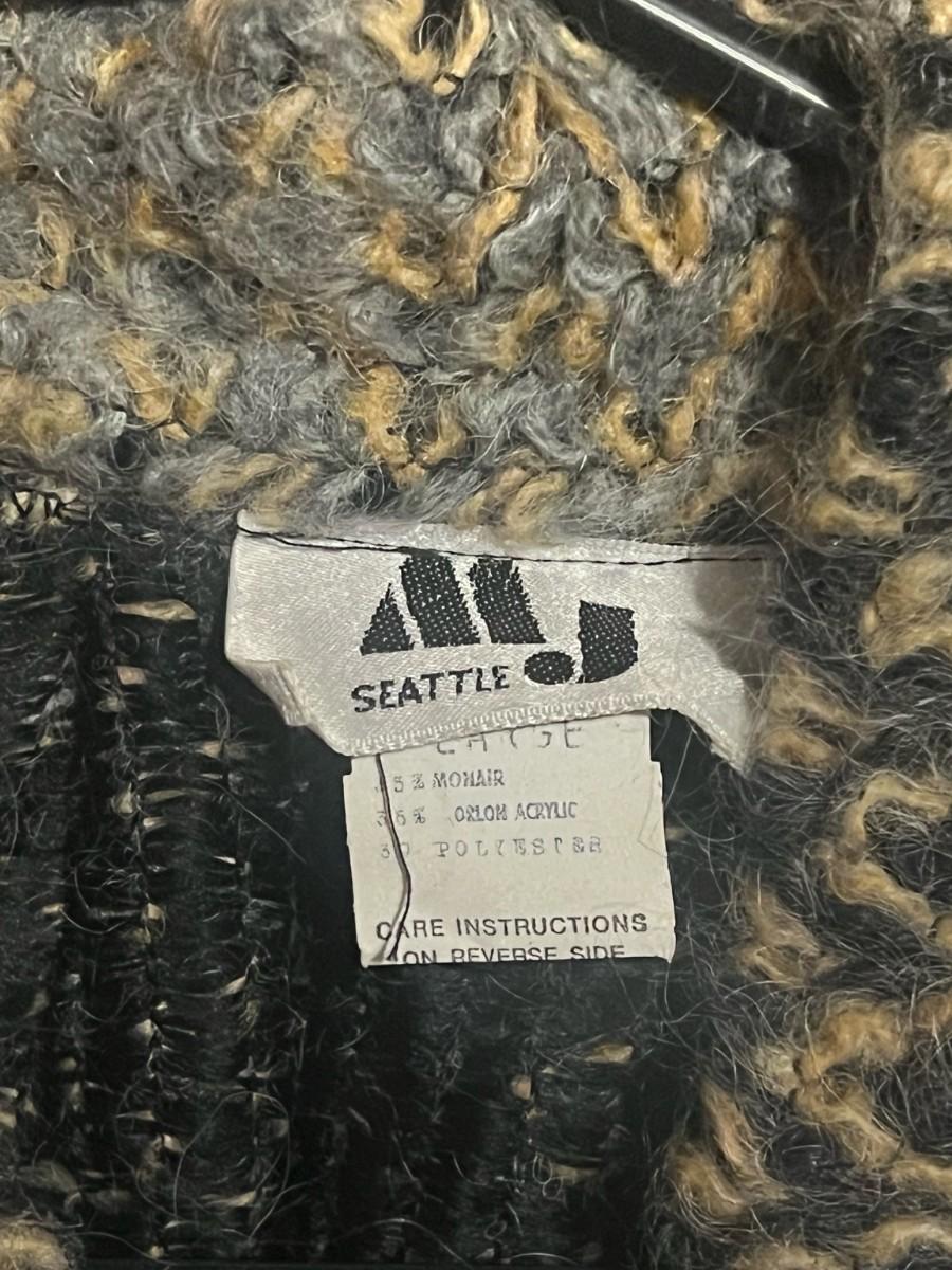 Vintage 1980s long mohair-blend sweater coat from All That Jazz – Seattle. Chunky knit with charcoal, cream, and tan tones, oversized draped front, and knit pockets. Highly sought-after retro boho outerwear that pairs well with modern fashion.