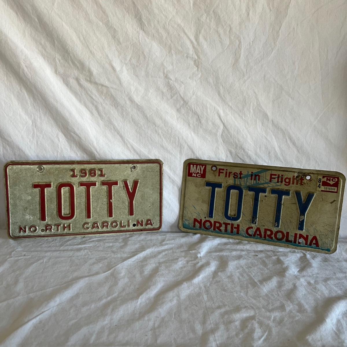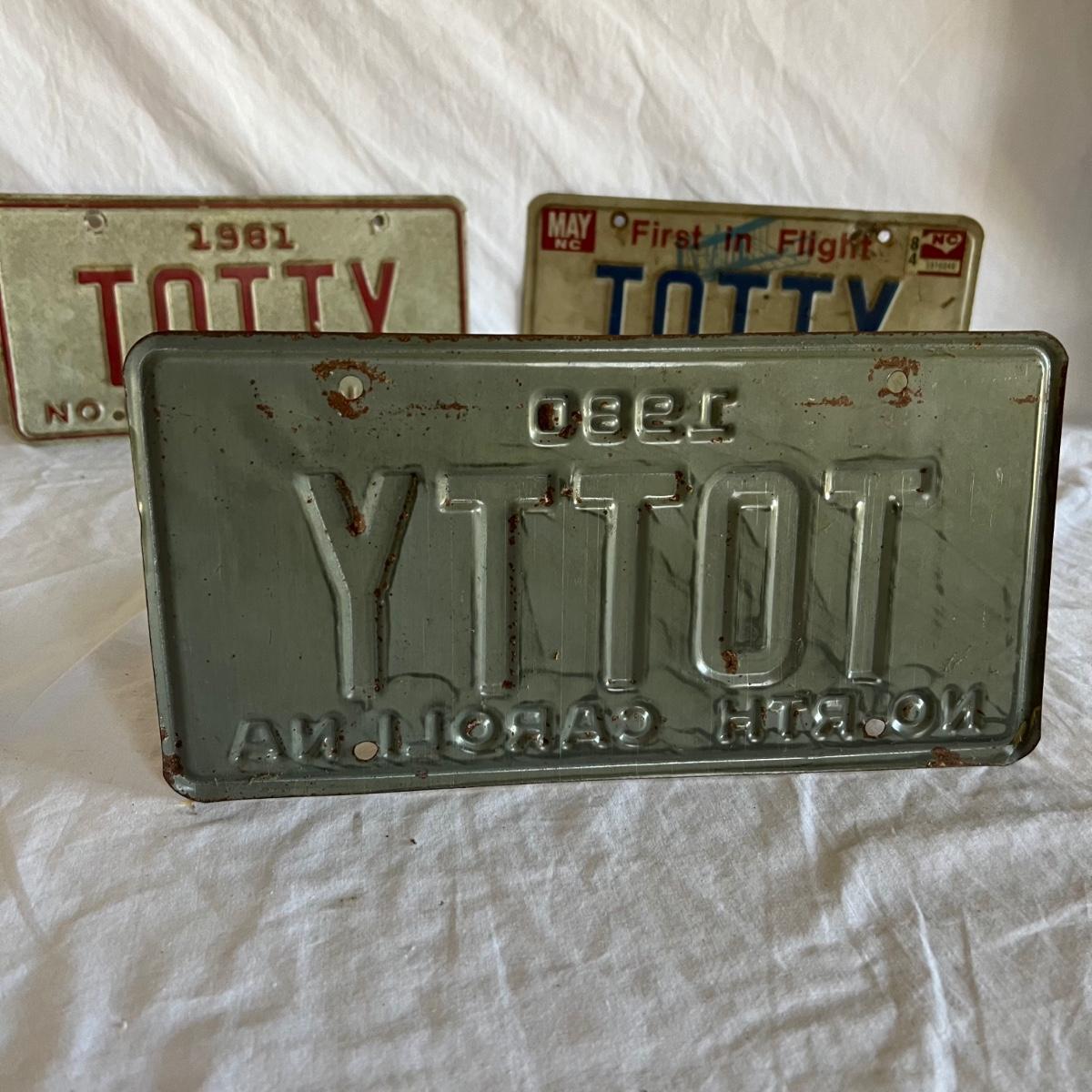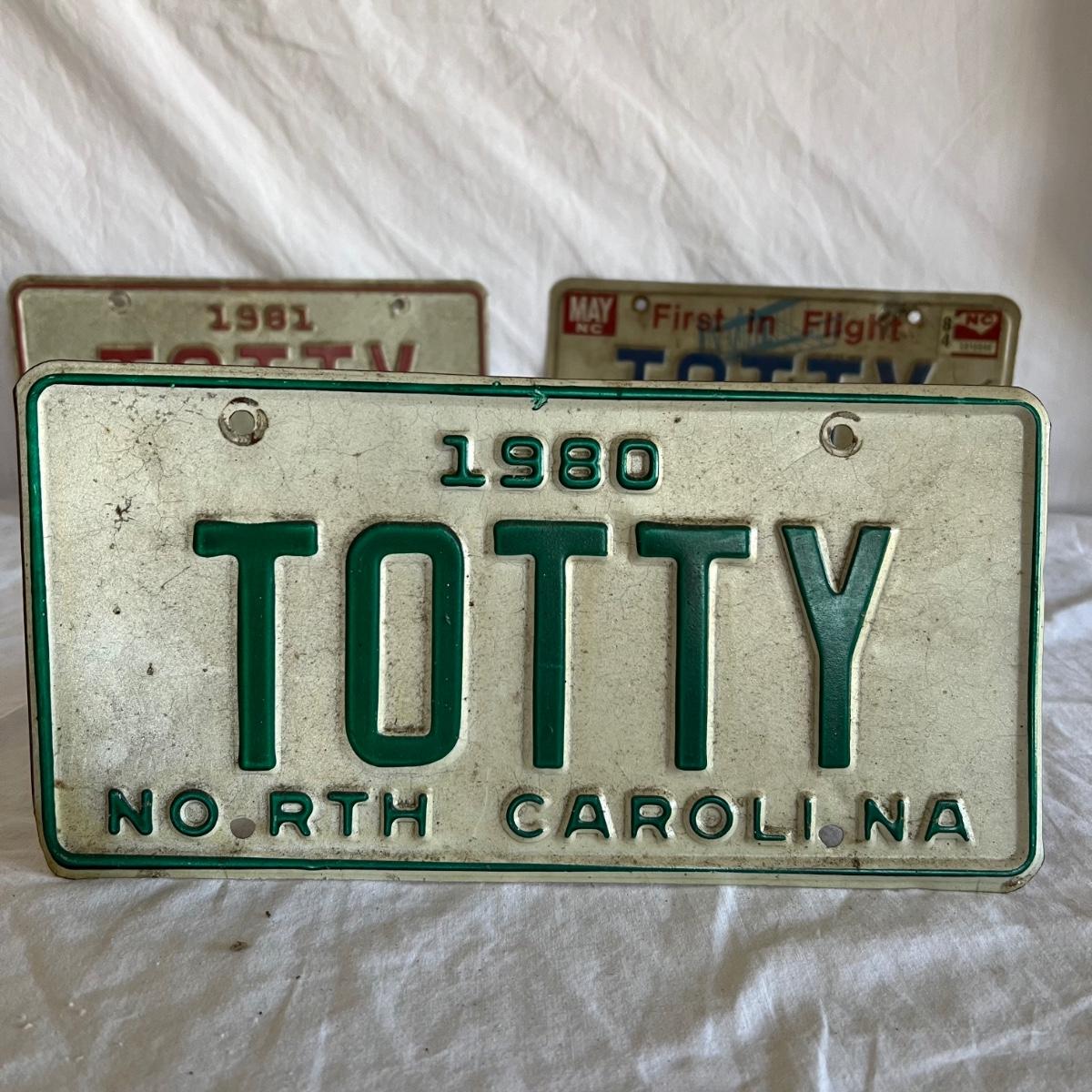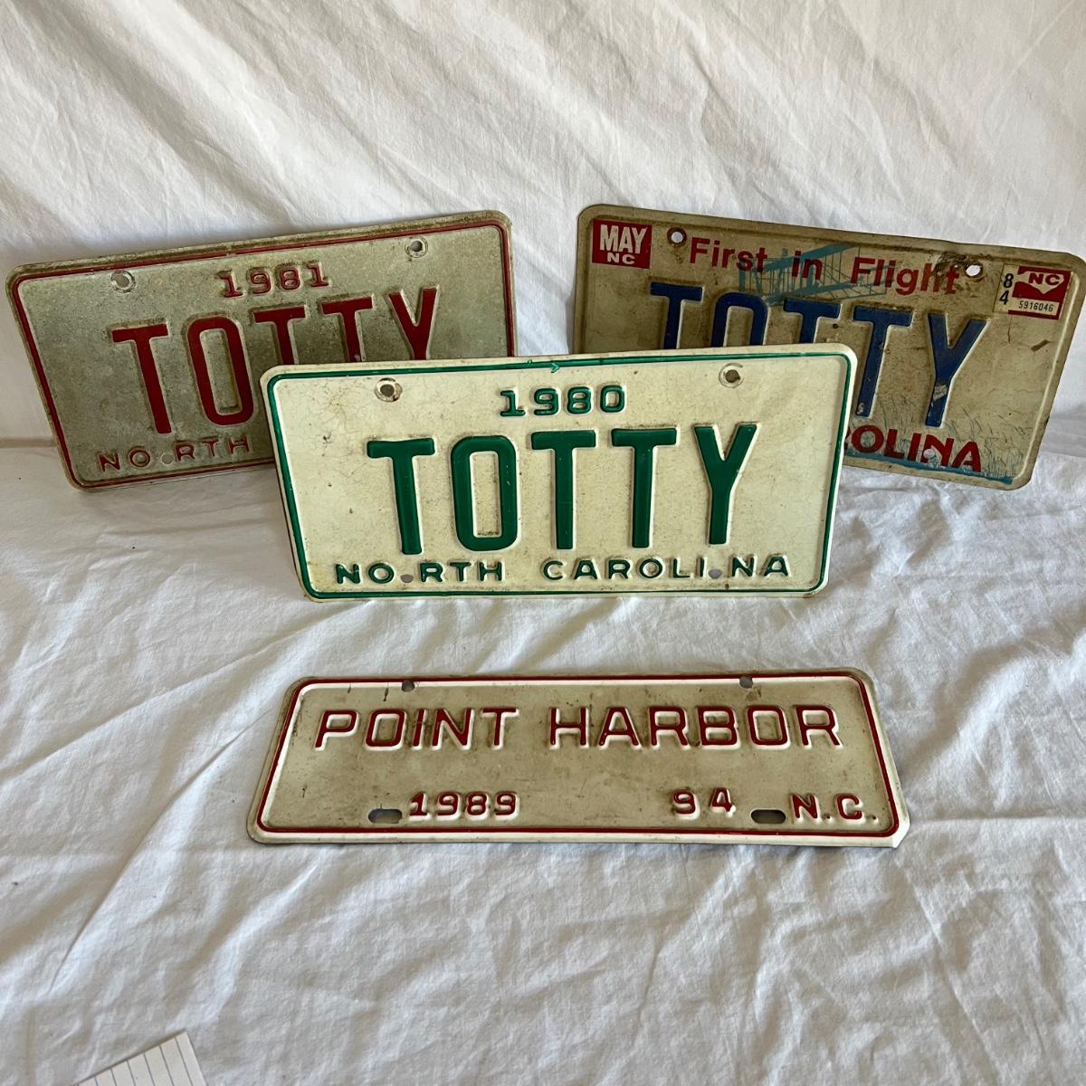 Three North Carolina personalized license plates all from the 80’s that say Totty. The fourth plate is also from N.C but it is smaller and says Point Harbor; it measures 12” x 4”H.