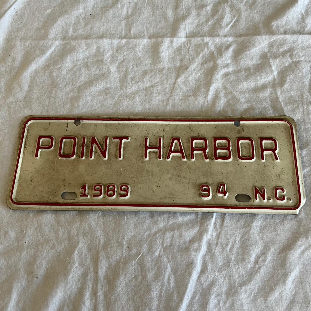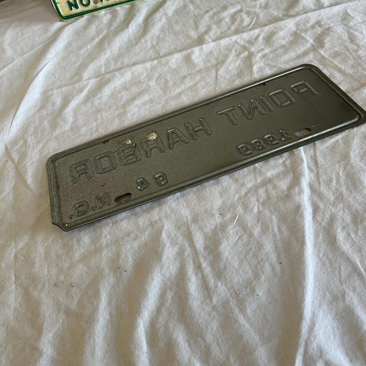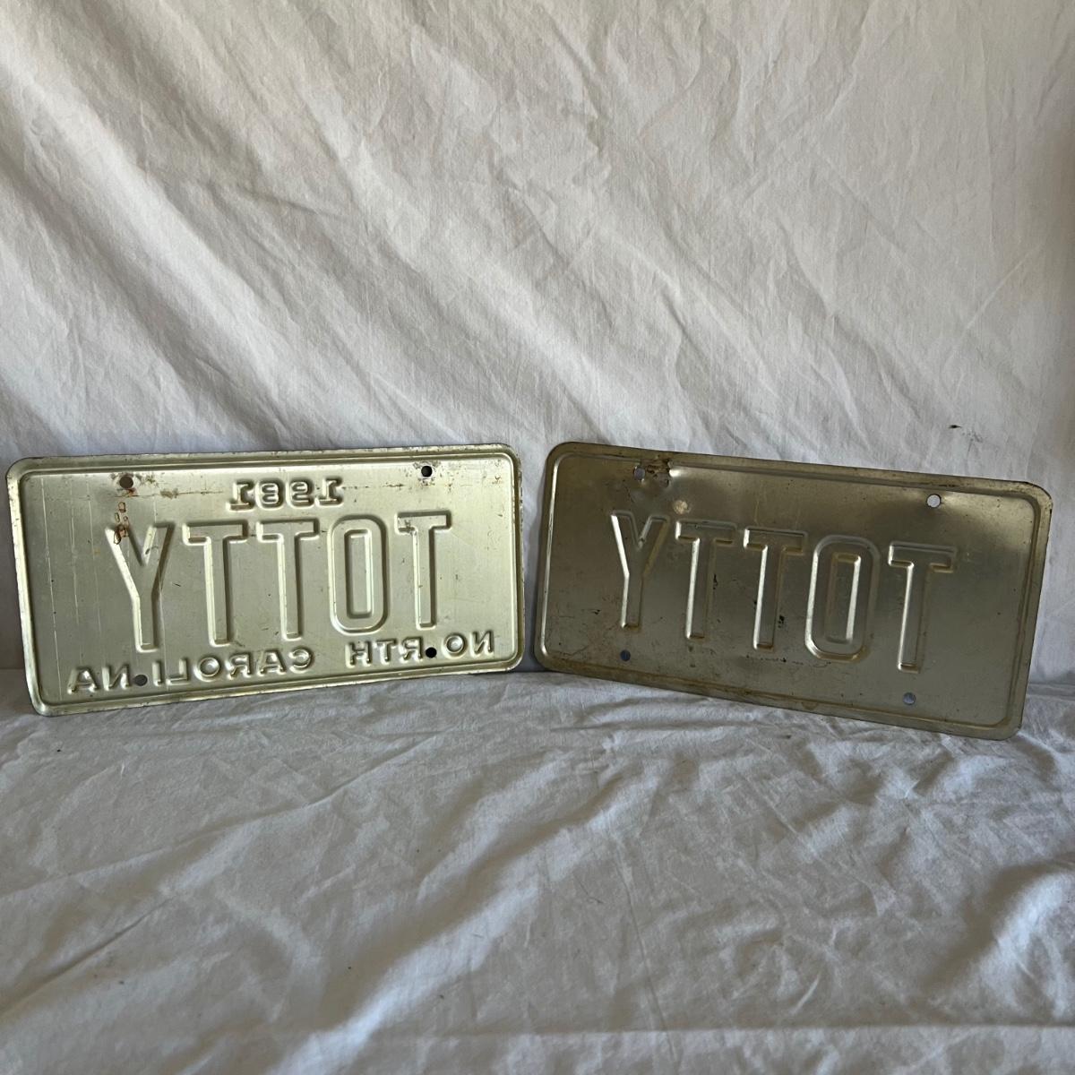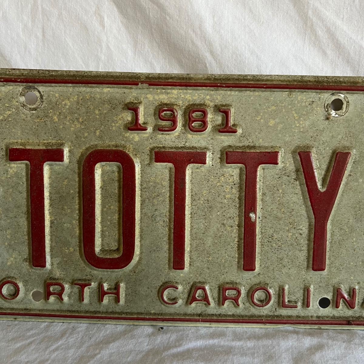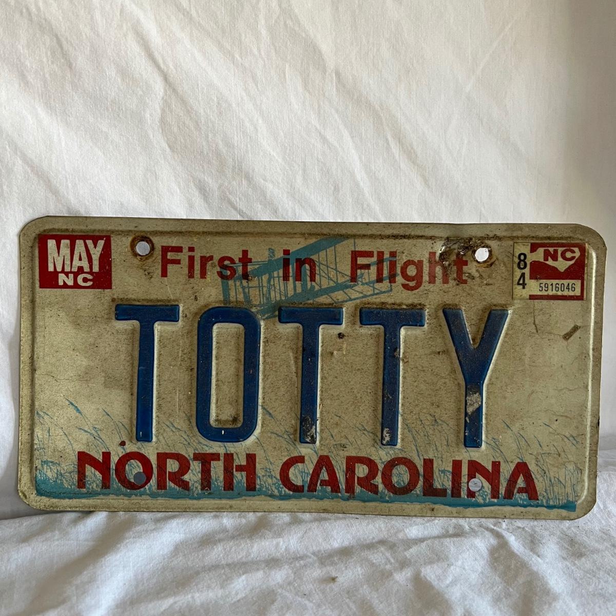 Three North Carolina personalized license plates all from the 80’s that say Totty. The fourth plate is also from N.C but it is smaller and says Point Harbor; it measures 12” x 4”H.