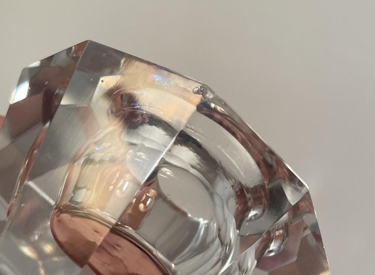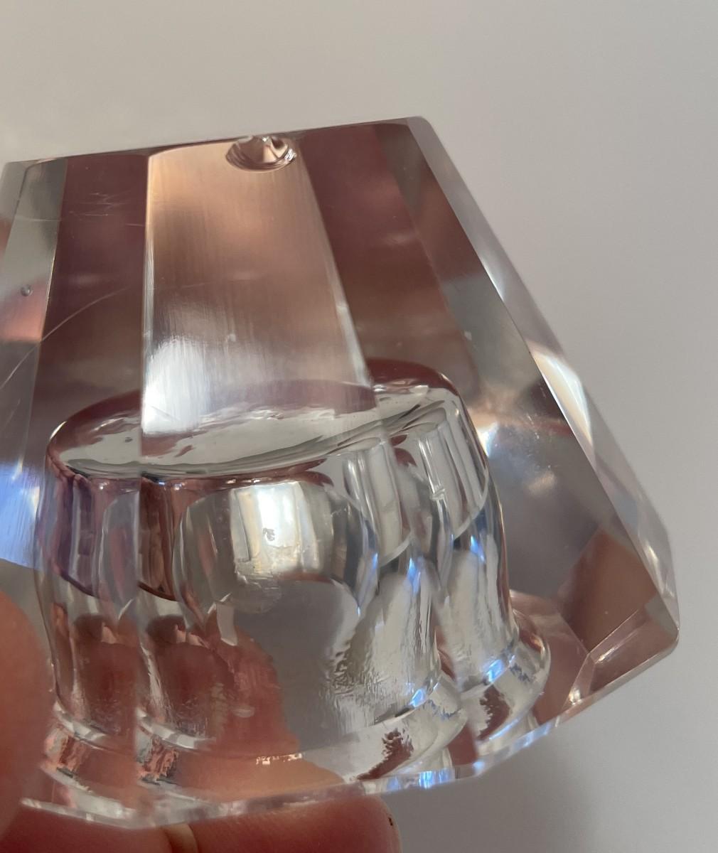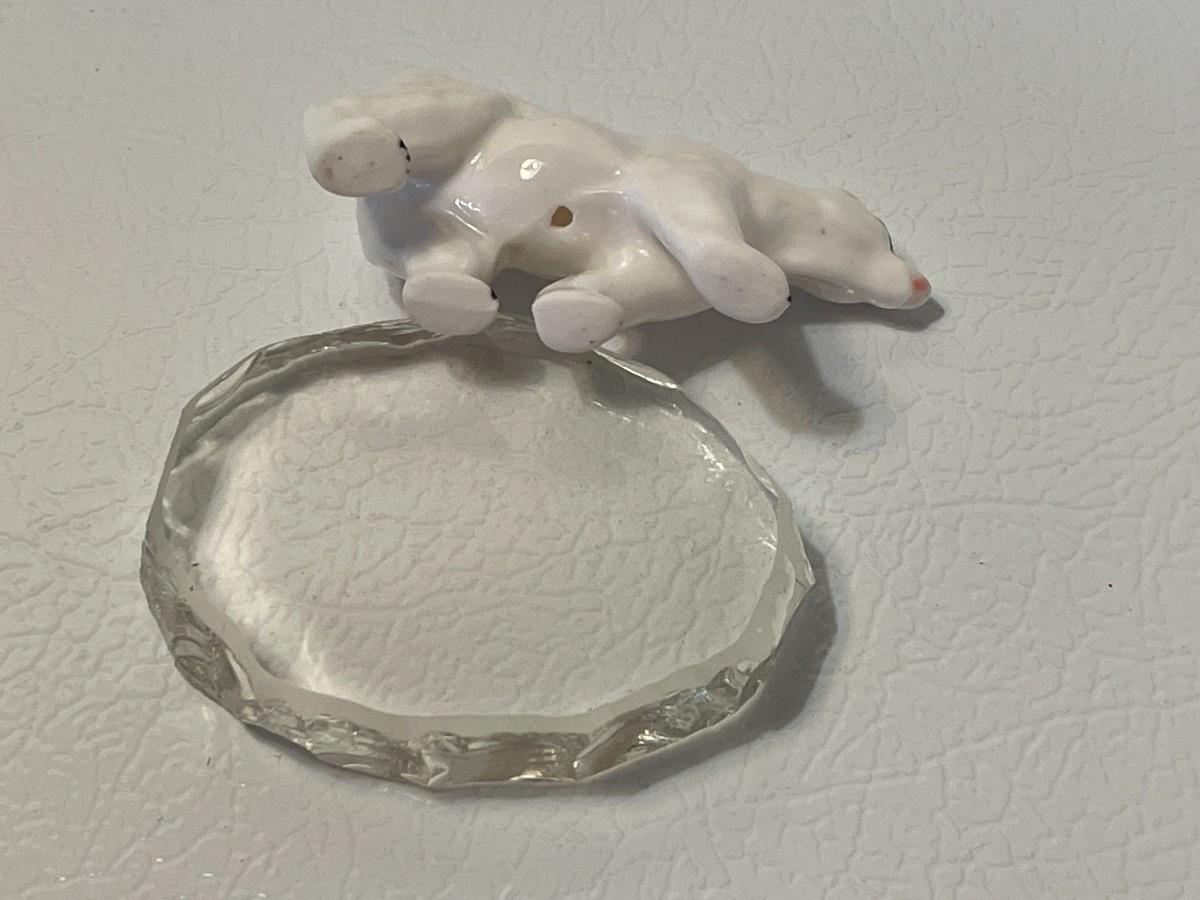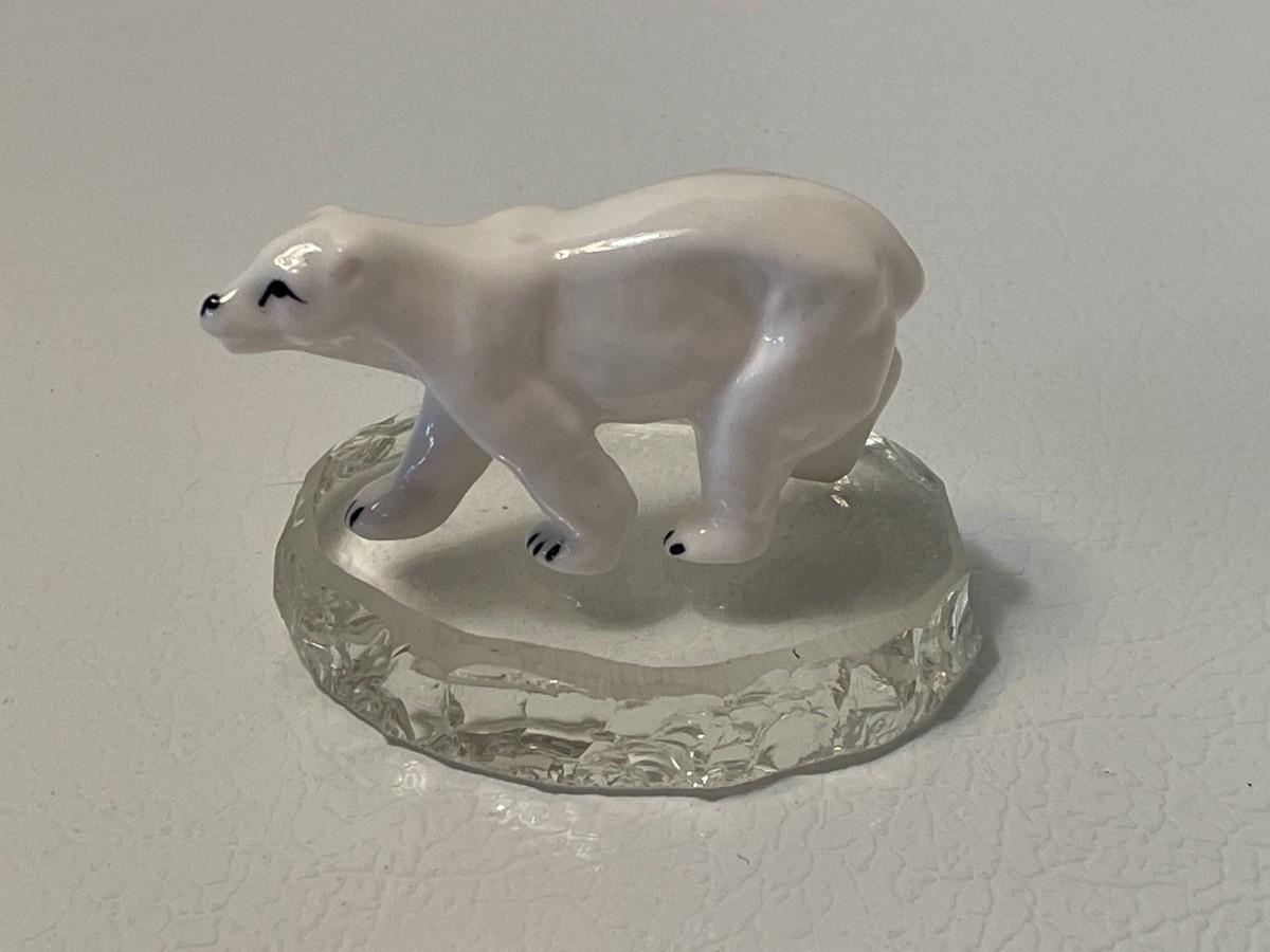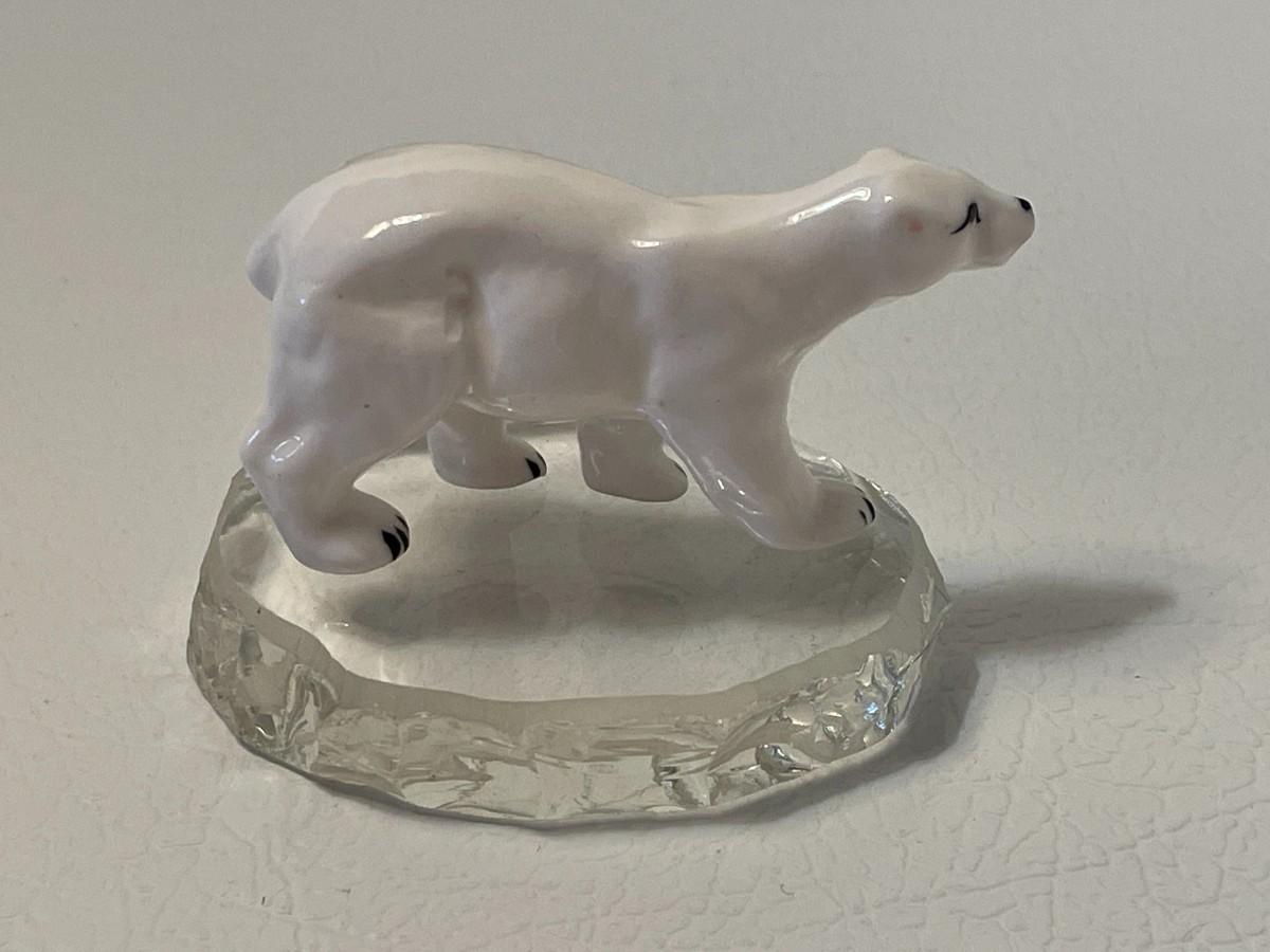 The polar bear and the piece of ice are separate. The polar bear is made from ceramic and is about 2.5 inches long and about 1.5 inches tall. The piece of ice is made of glass. These were purchased by the consignor's mother when she took a trip to Alaska in the 1980s.