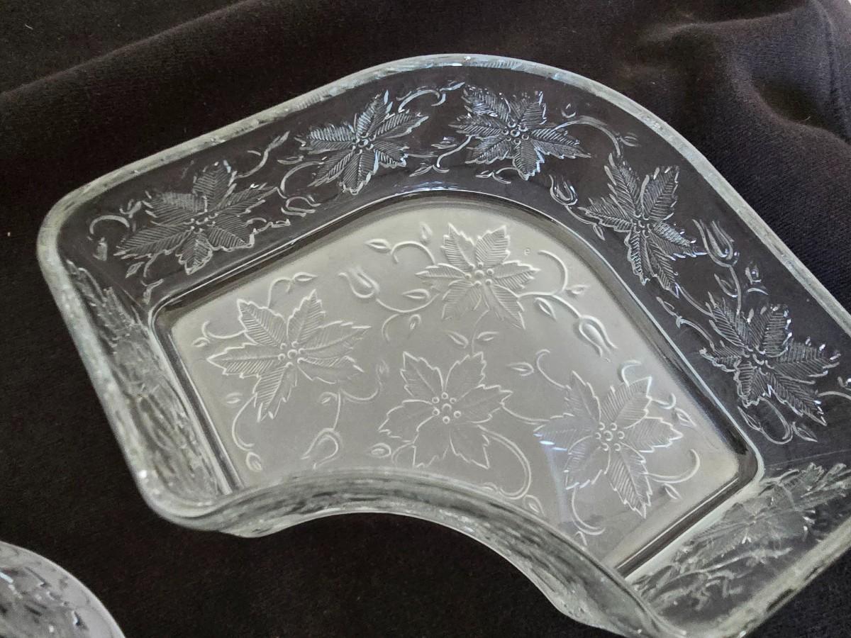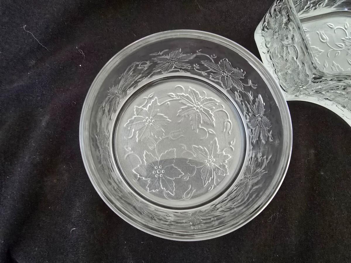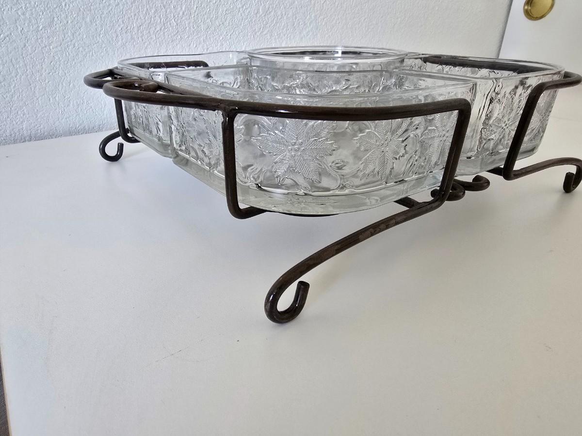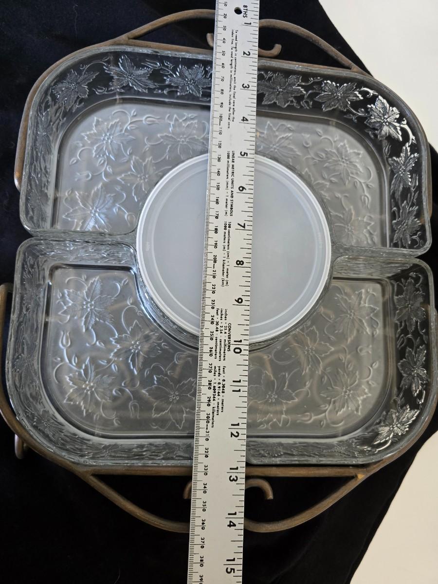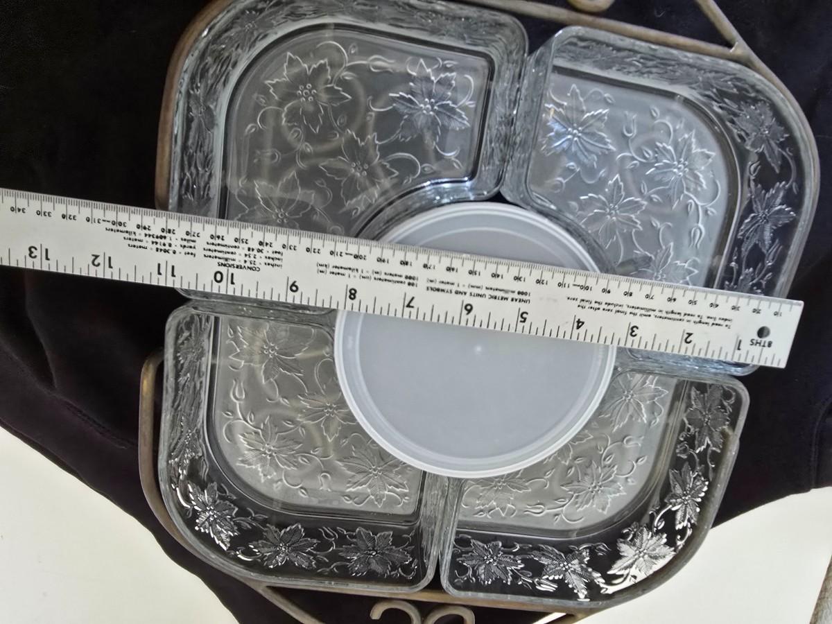 Gorgeous entertainment piece from Princess House®. The set is in the Fantasia® Crystal pattern that features an embossed poinsettia motif. This 7-piece Chip and Dip Set includes 5 crystal pieces, a plastic lid and one-piece metal holder. This set does NOT come with the original box. Also included is 4 Princess House Fantasia Cappuccino Mugs
