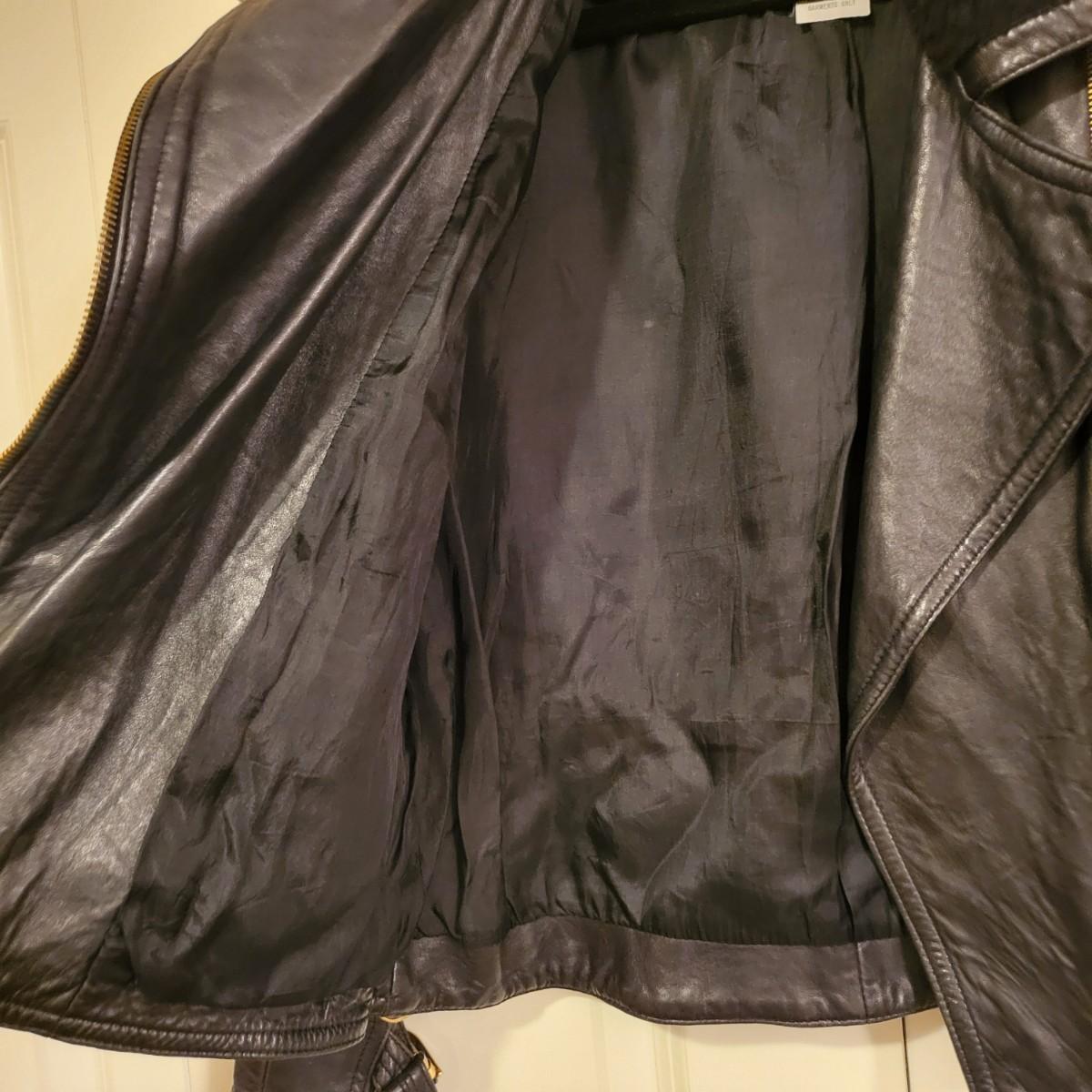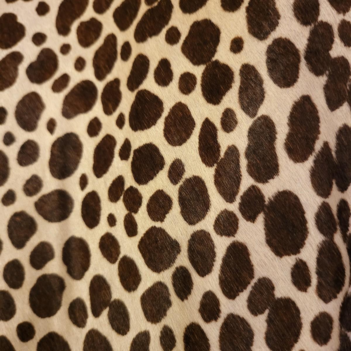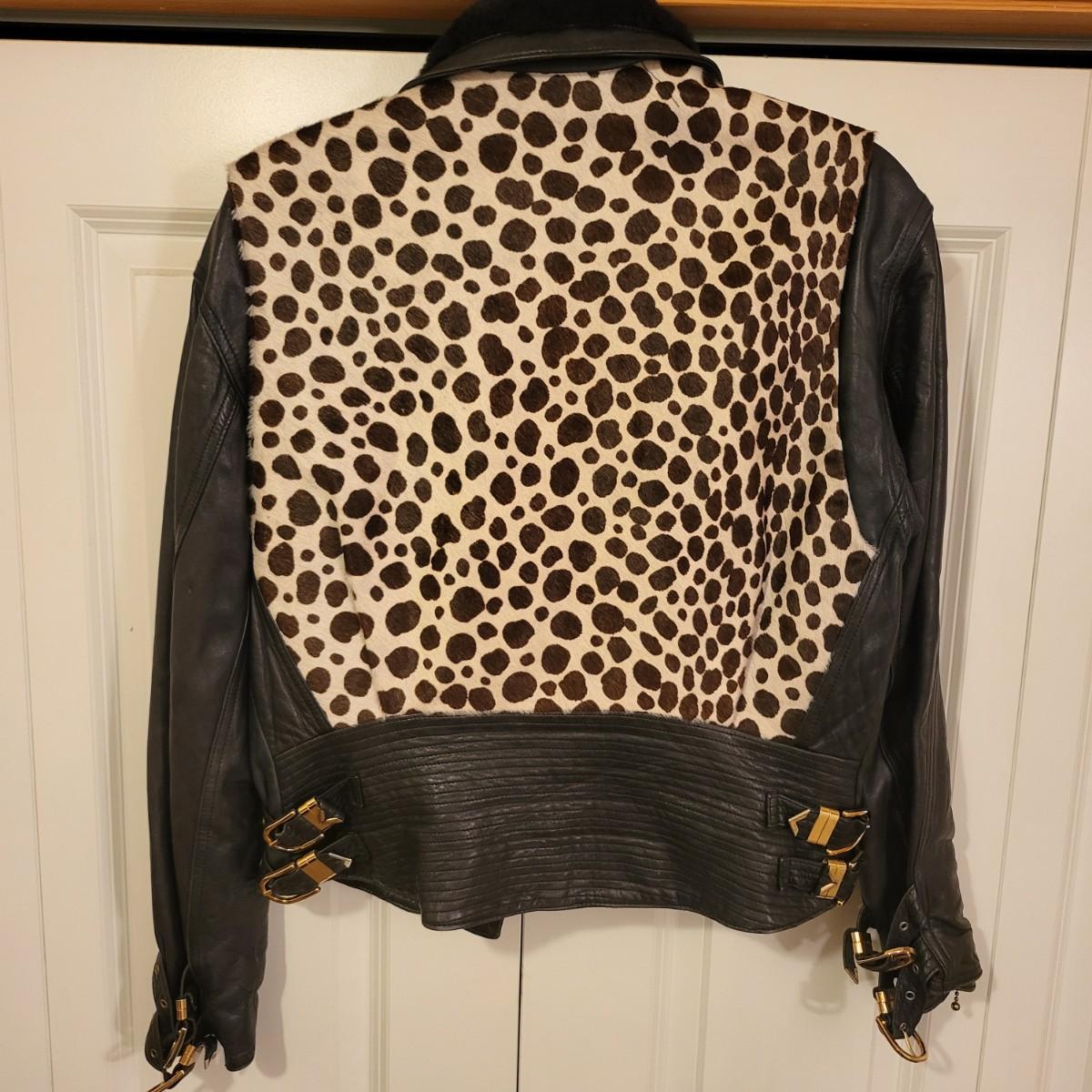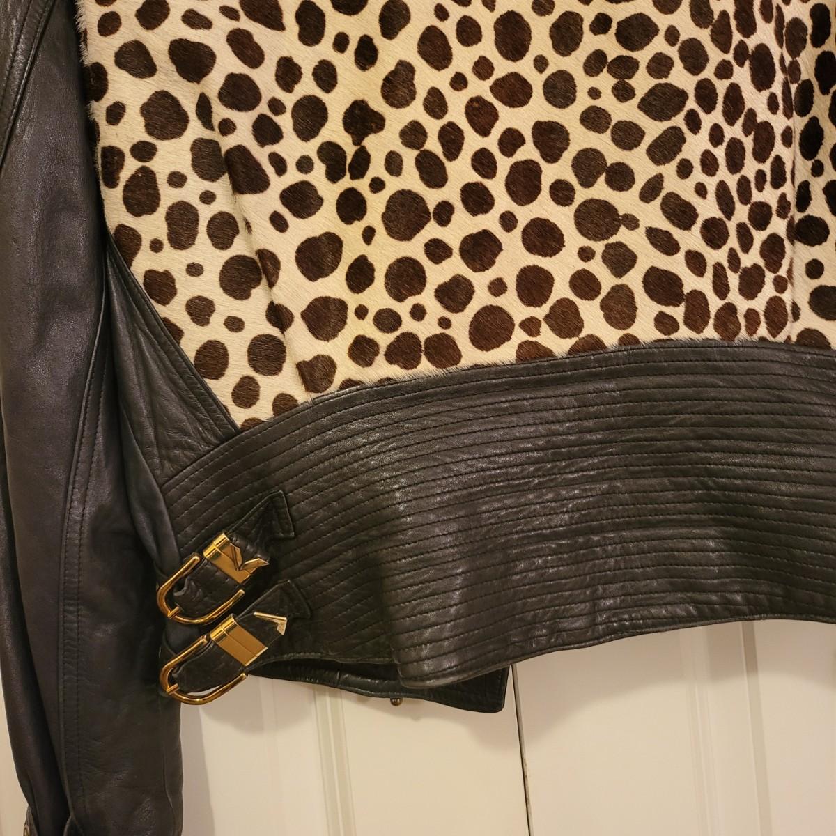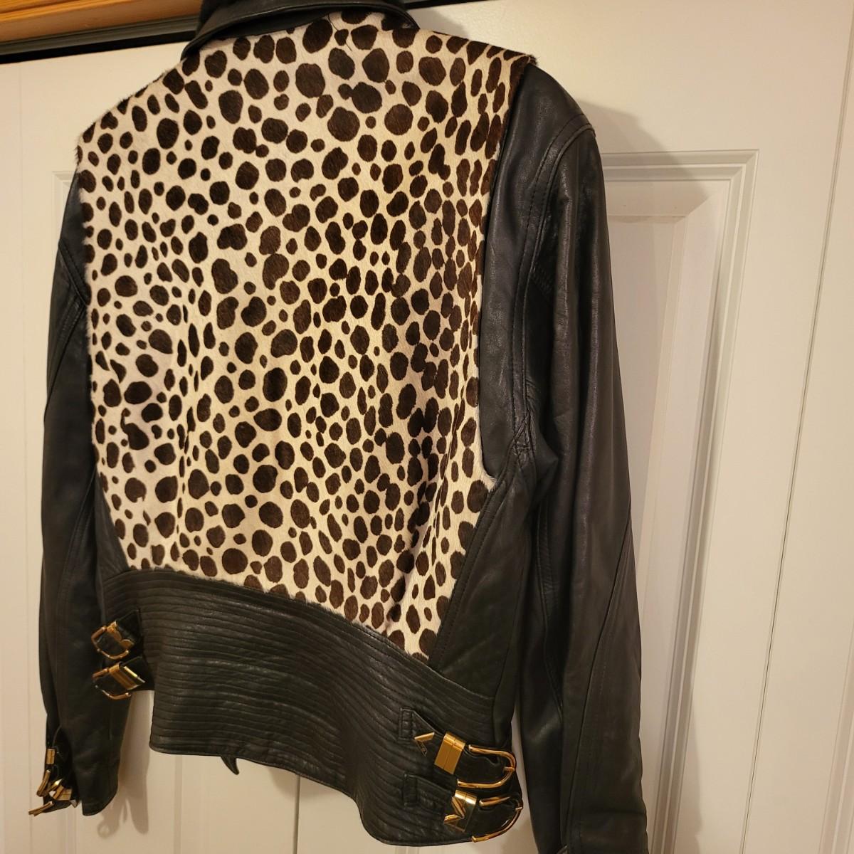 Late 80's black leather jacket with animal print fur shoulders & back. Gold buckle accents. Zip front, two front pockets, wool collar. Size 8. 17" shoulder to shoulder. 22" long.
