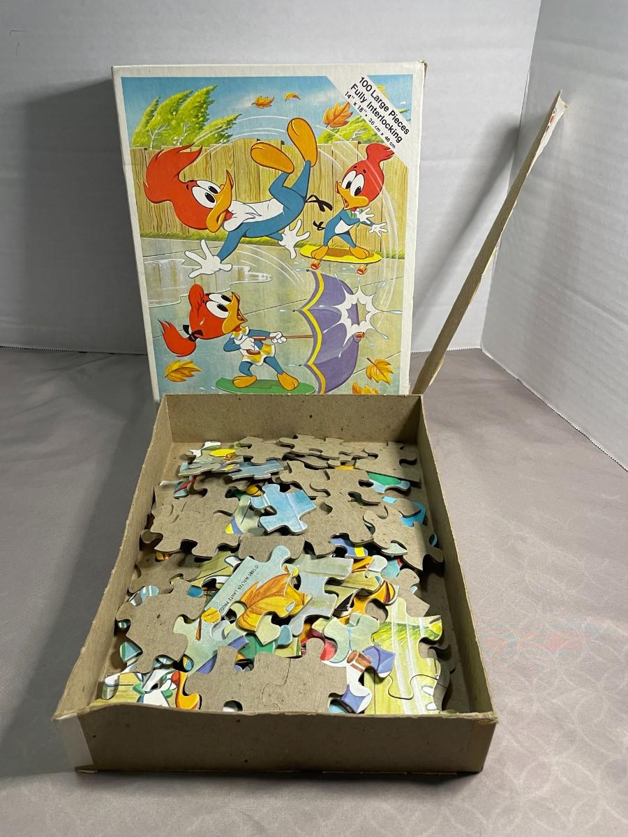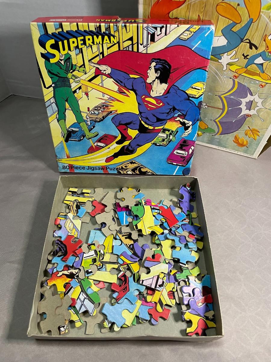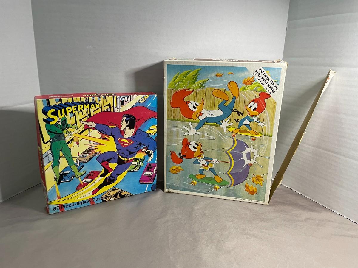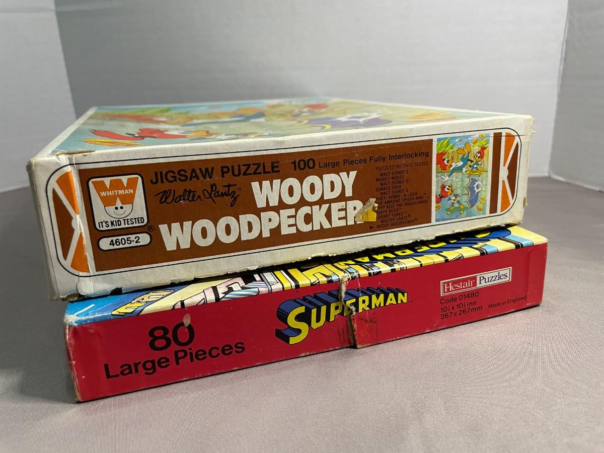The Woody Woodpecker puzzle is 1980 and the Superman puzzle is 1981. I don't know if they are complete. The Superman puzzle was distributed by Hestair of England.