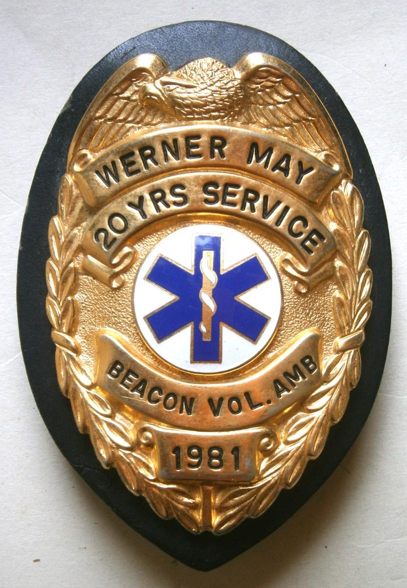 1981 Beacon NY Vol. Ambulance Member 20 Yrs Service badge, 3 in. tall, metal with gold finish mounted on leather belt strap.