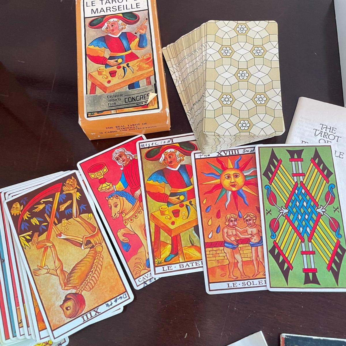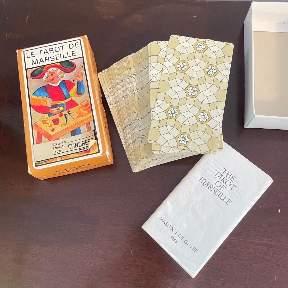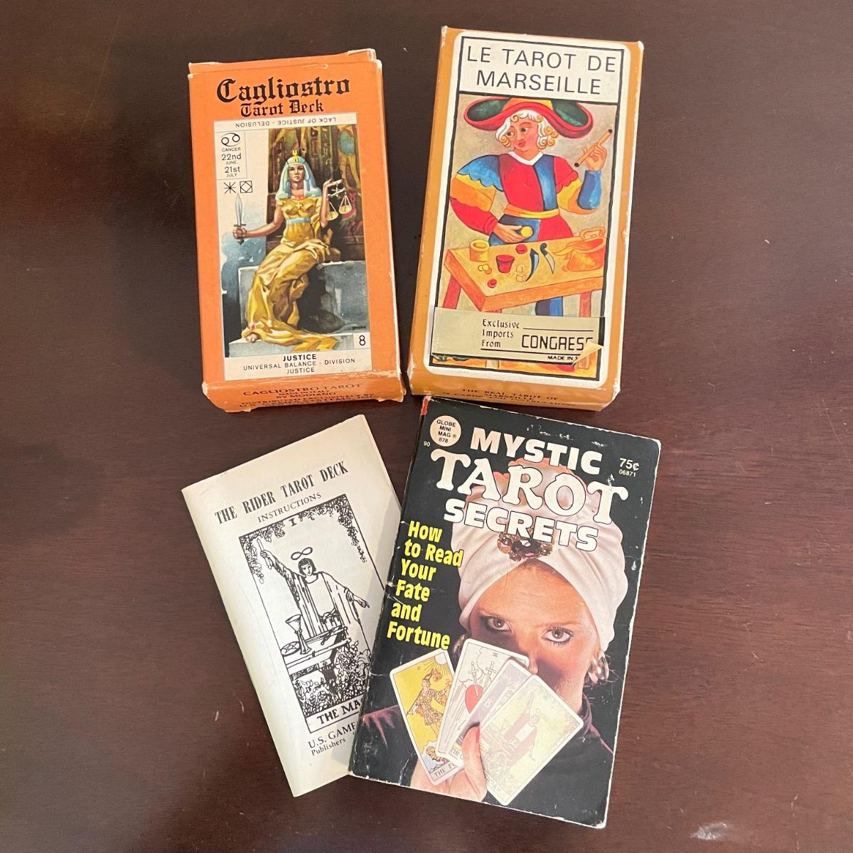 Two fun finds- a 1981 Cagliostro Tarot Deck and a 1983 Le Tarot de Marseille along with two instruction guides. Cards appear lightly used, the Marseille has some hand written notes noticed on cards, see images. We cannot verify both decks are complete. Shipping available. All sales are final. No returns or refunds. Please bid accordingly.