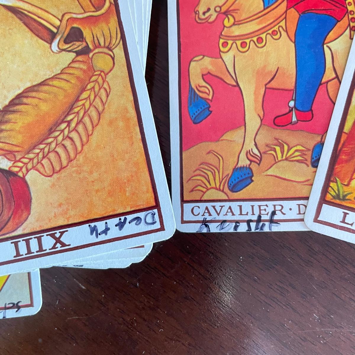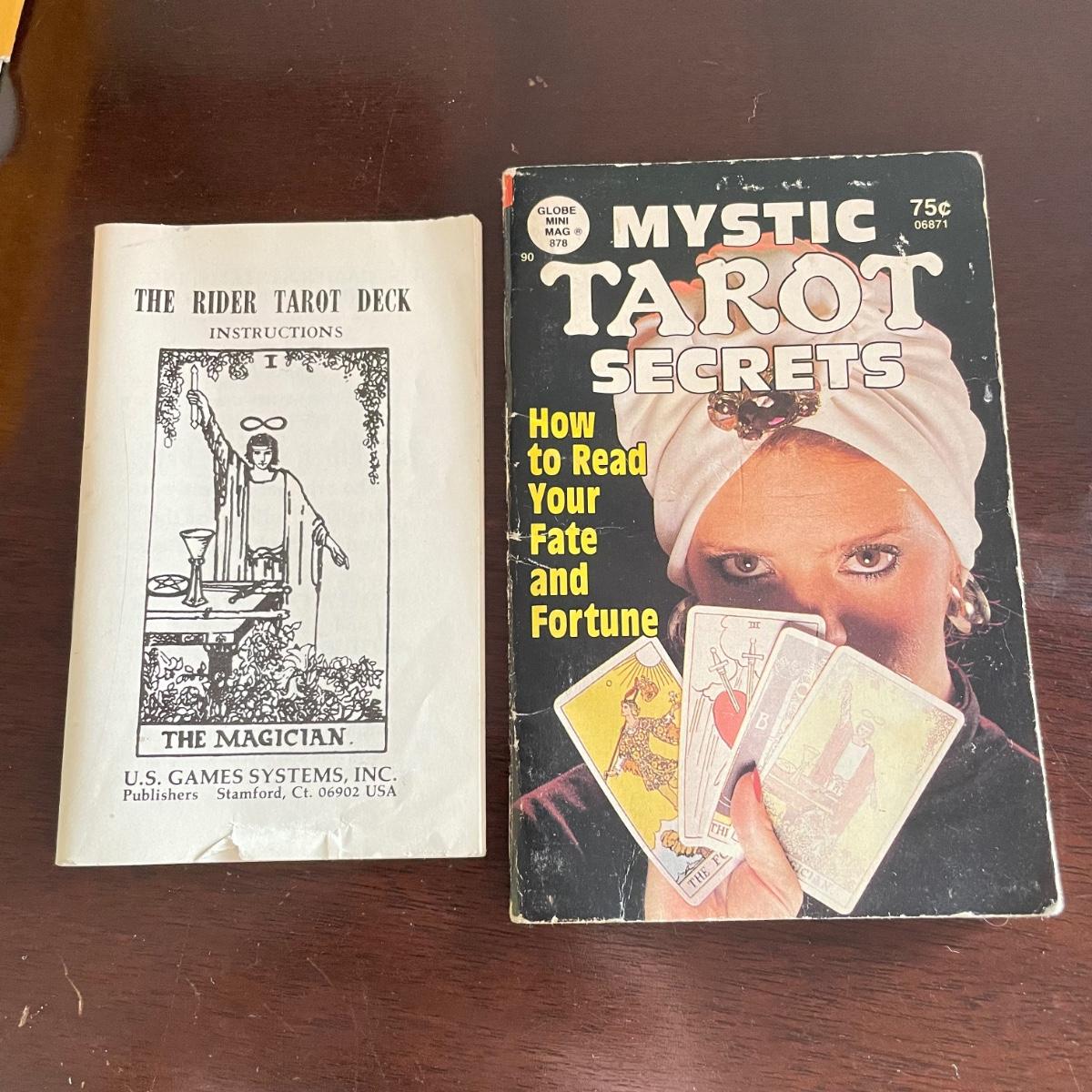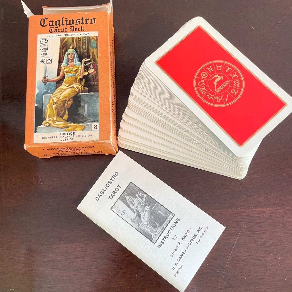 Two fun finds- a 1981 Cagliostro Tarot Deck and a 1983 Le Tarot de Marseille along with two instruction guides. Cards appear lightly used, the Marseille has some hand written notes noticed on cards, see images. We cannot verify both decks are complete. Shipping available. All sales are final. No returns or refunds. Please bid accordingly.