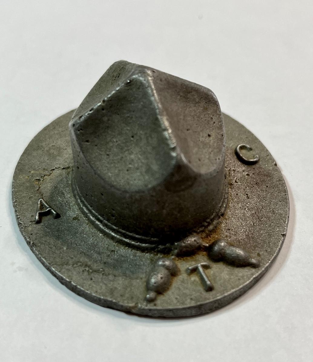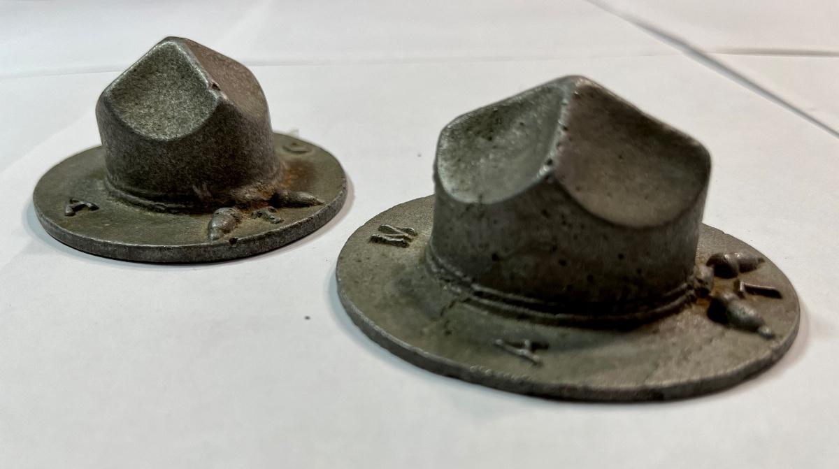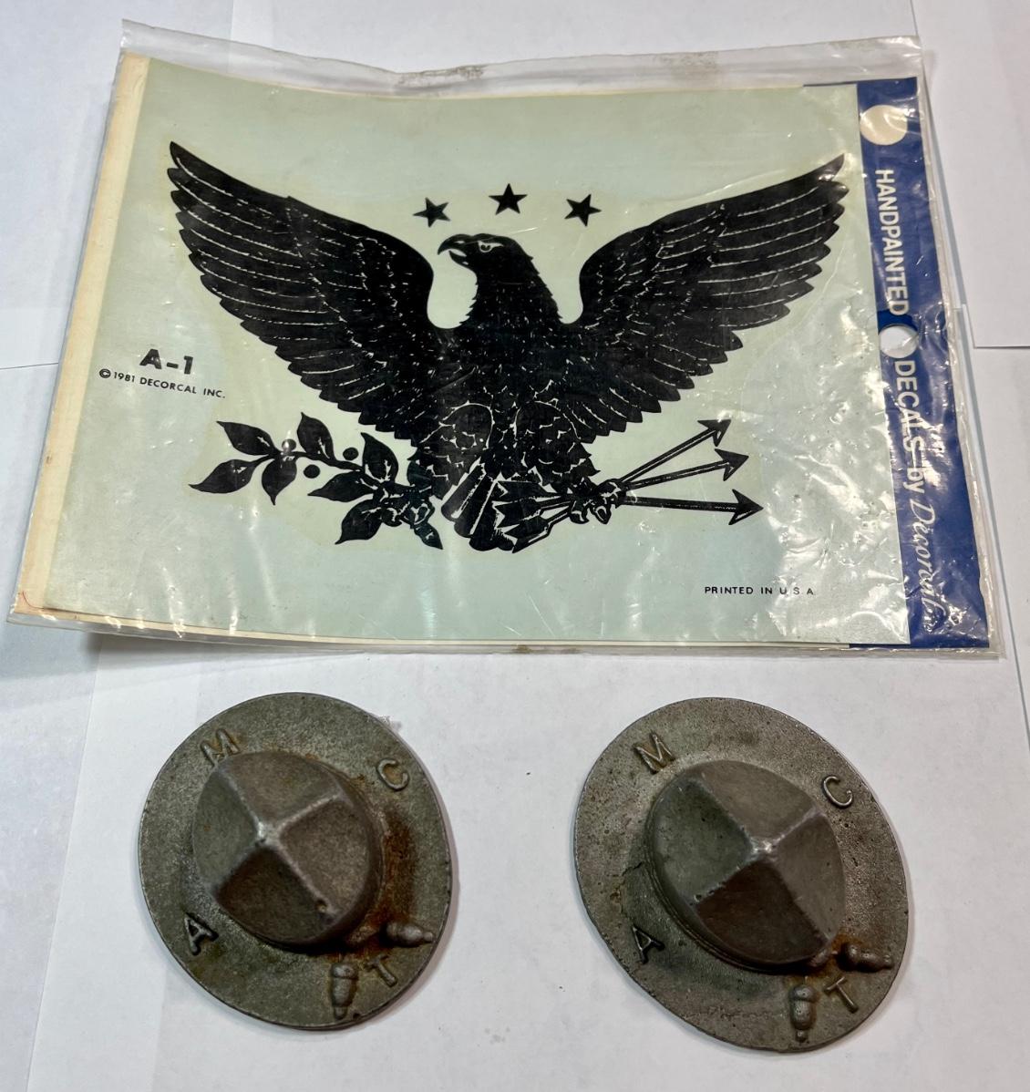 This lot includes 2 military style drill sargent hats that are made of pewter and are stamped TAMC along the brim. The hats are about 4" long. The decal is an A-1 Eagle, about 7" long and was printed in the USA.