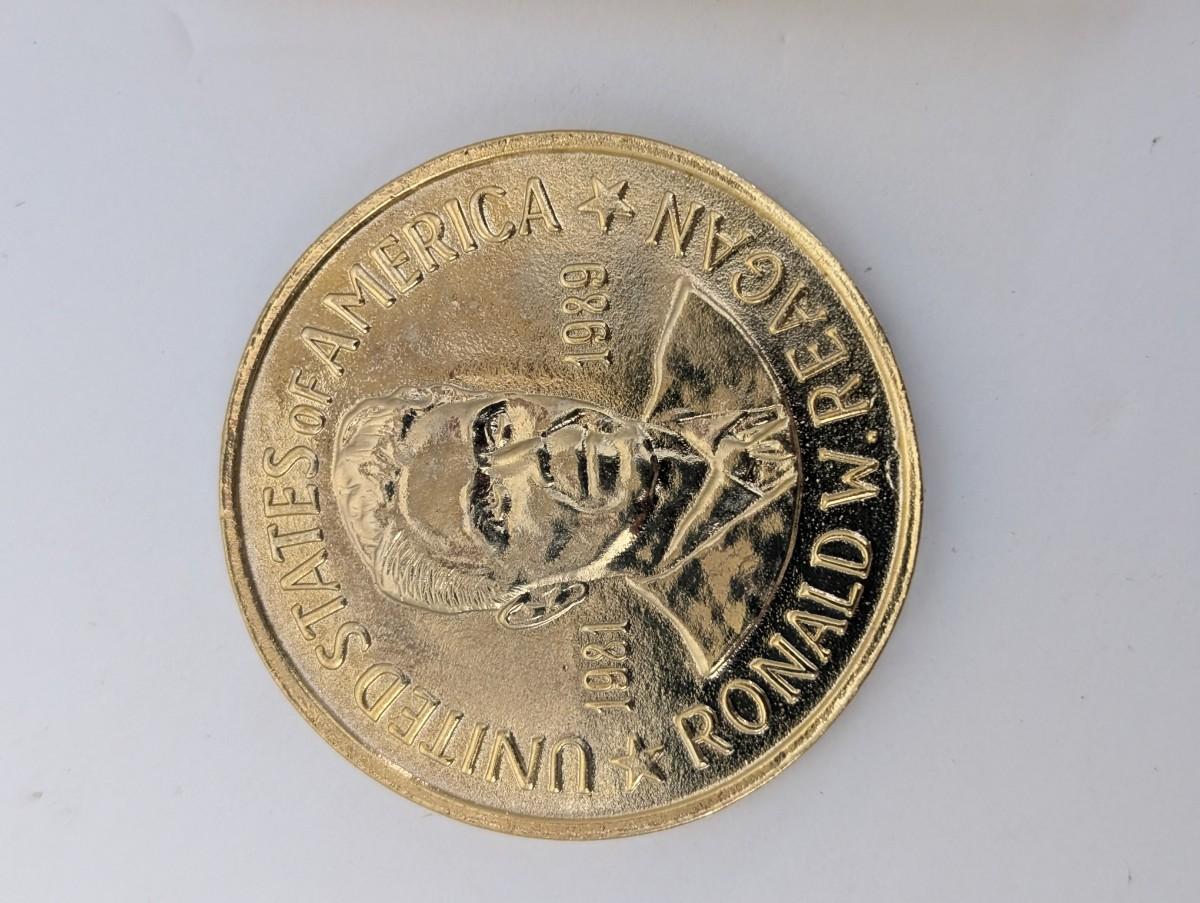 Ronald Reagan, commemorative coin, 1981, 40th president, gold tone coin, political memorabilia, presidential token, American history, collectible coin, Reagan era, patriotic collectible