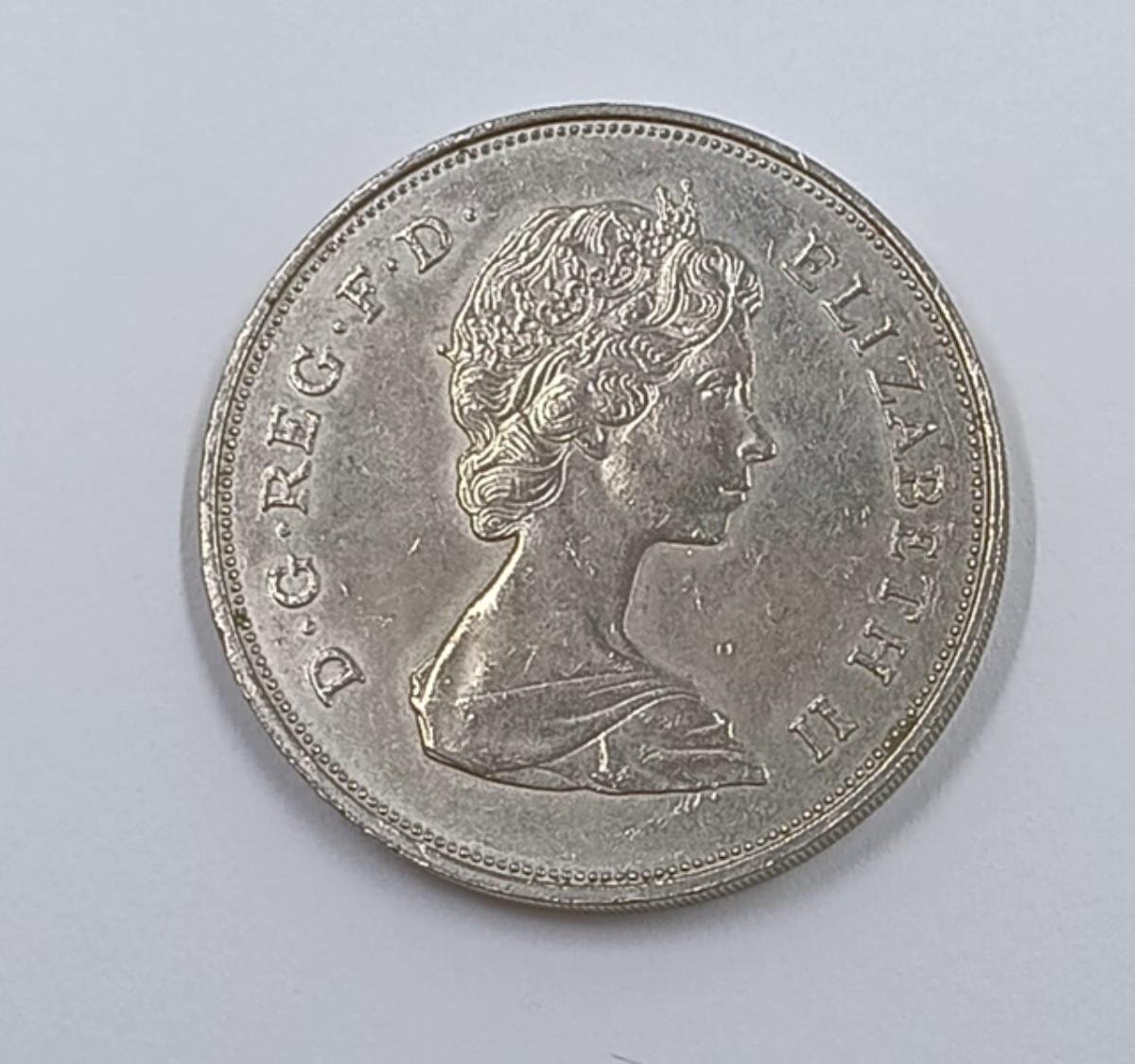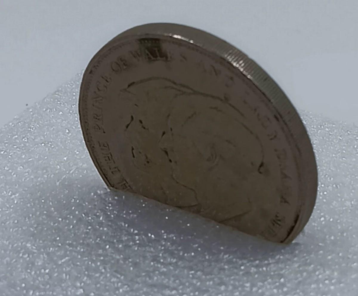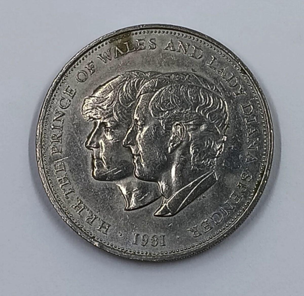 This is a 1981 commemorative coin featuring Queen Elizabeth II on one side and Prince Charles and Lady Diana on the other. This circulated coin is in good condition.