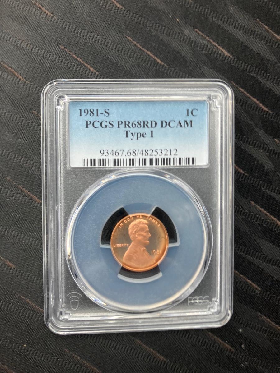 This is an elite 1981-S Type 1 (clear "S" mintmark) Lincoln cent proof struck at San Francisco, certified PCGS PR68RD DCAM (PCGS #93467). The Type 1 design features the bold, well-defined "S" above the date, making it scarcer and more desirable than the common Type 2. At PR68RD, it exhibits full original red luster, minimal imperfections under magnification, and the dramatic deep cameo contrast between frosted devices and mirrored fields—highly sought by modern proof collectors. The PCGS slab (cert #9346768/48253212) guarantees authenticity and grade.