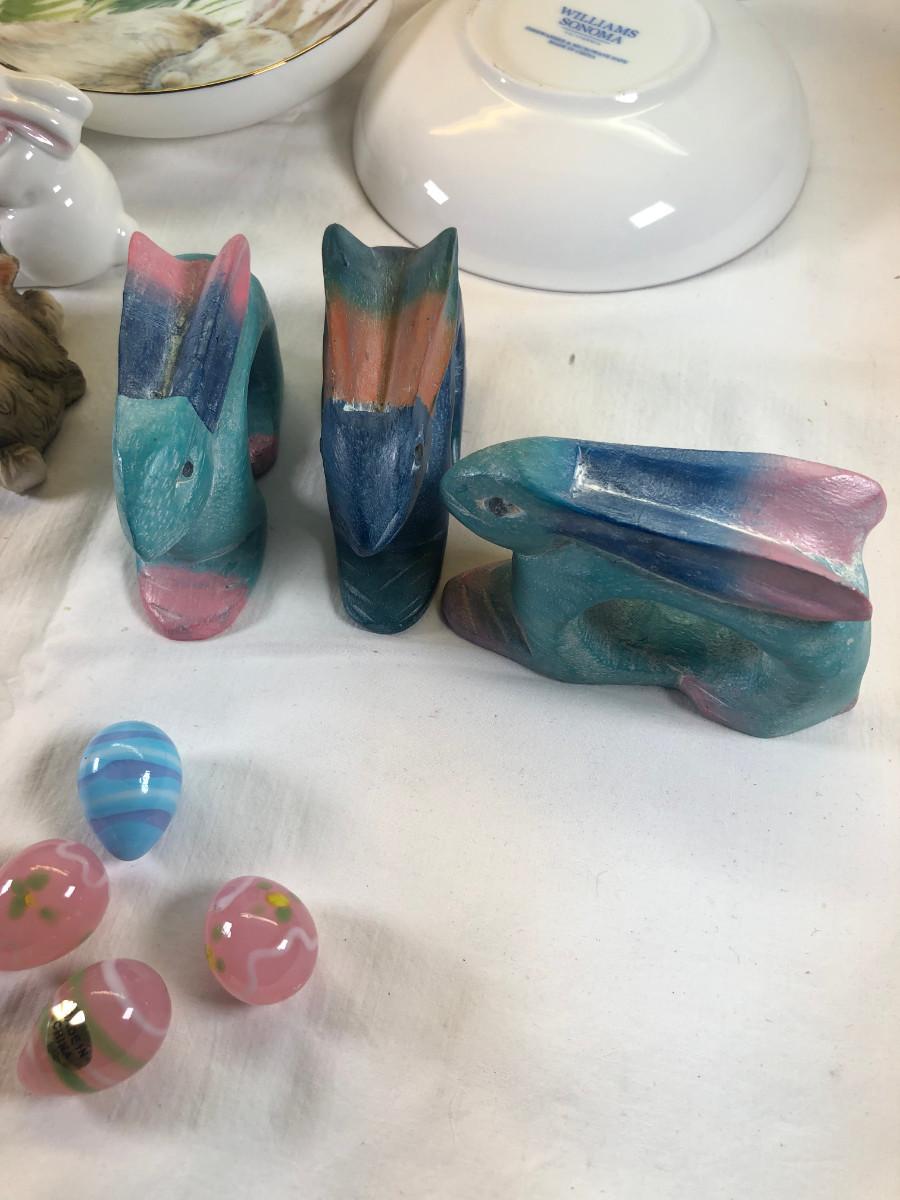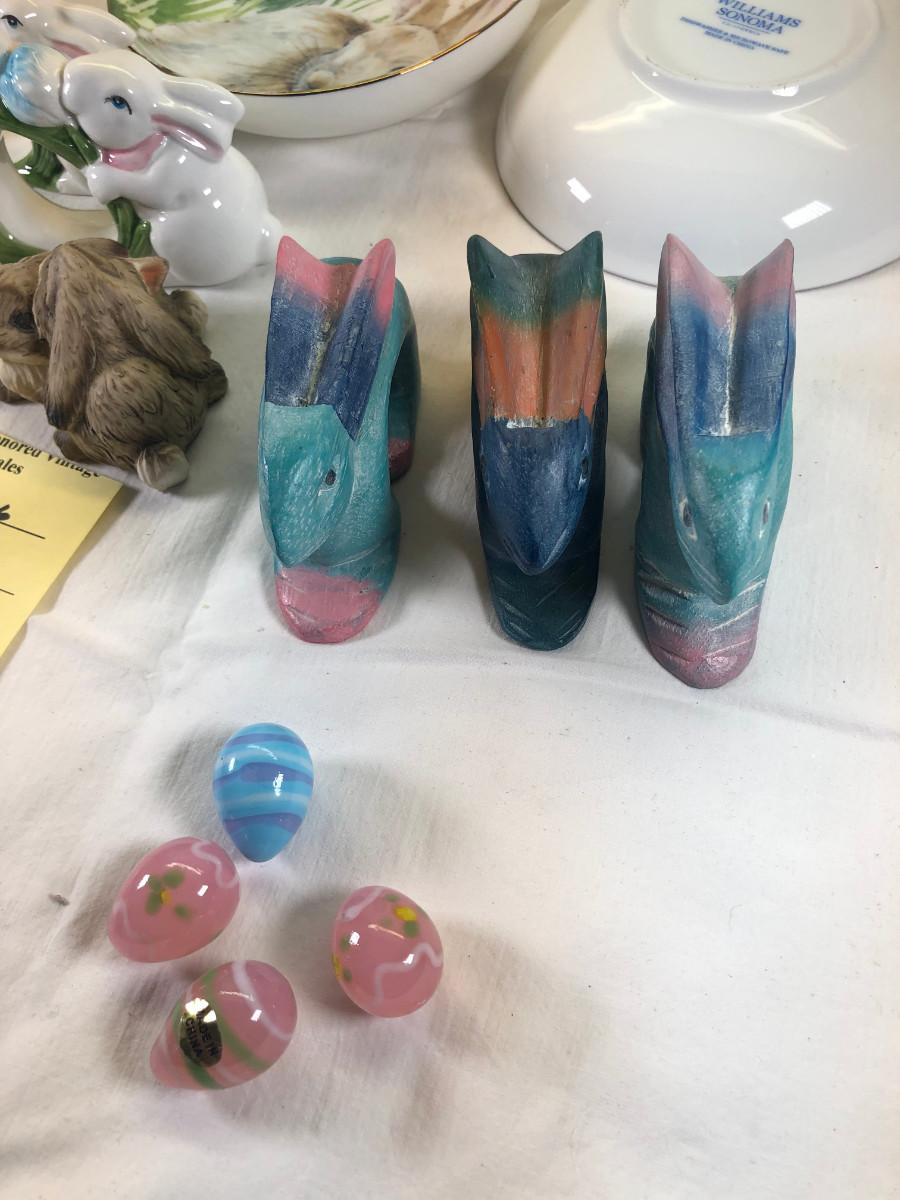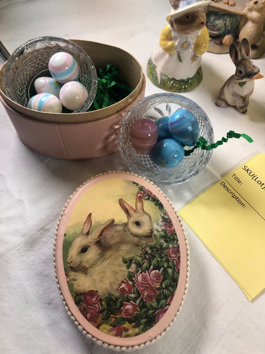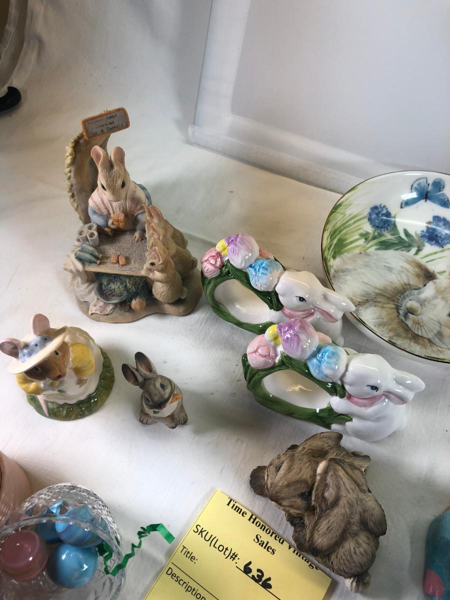 Mice and Rabbit figurines Glass eggs, Bunny plates,