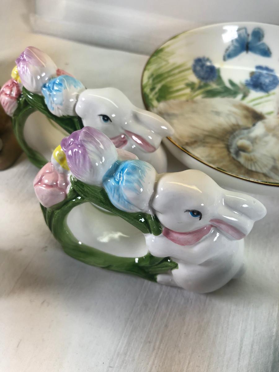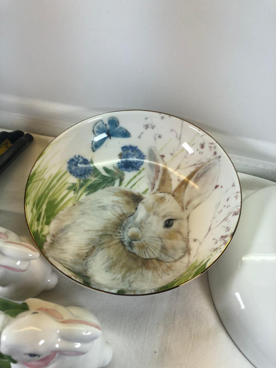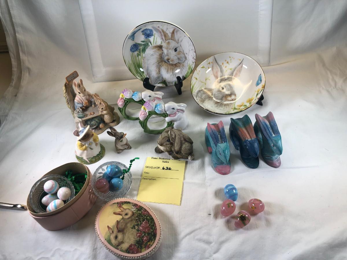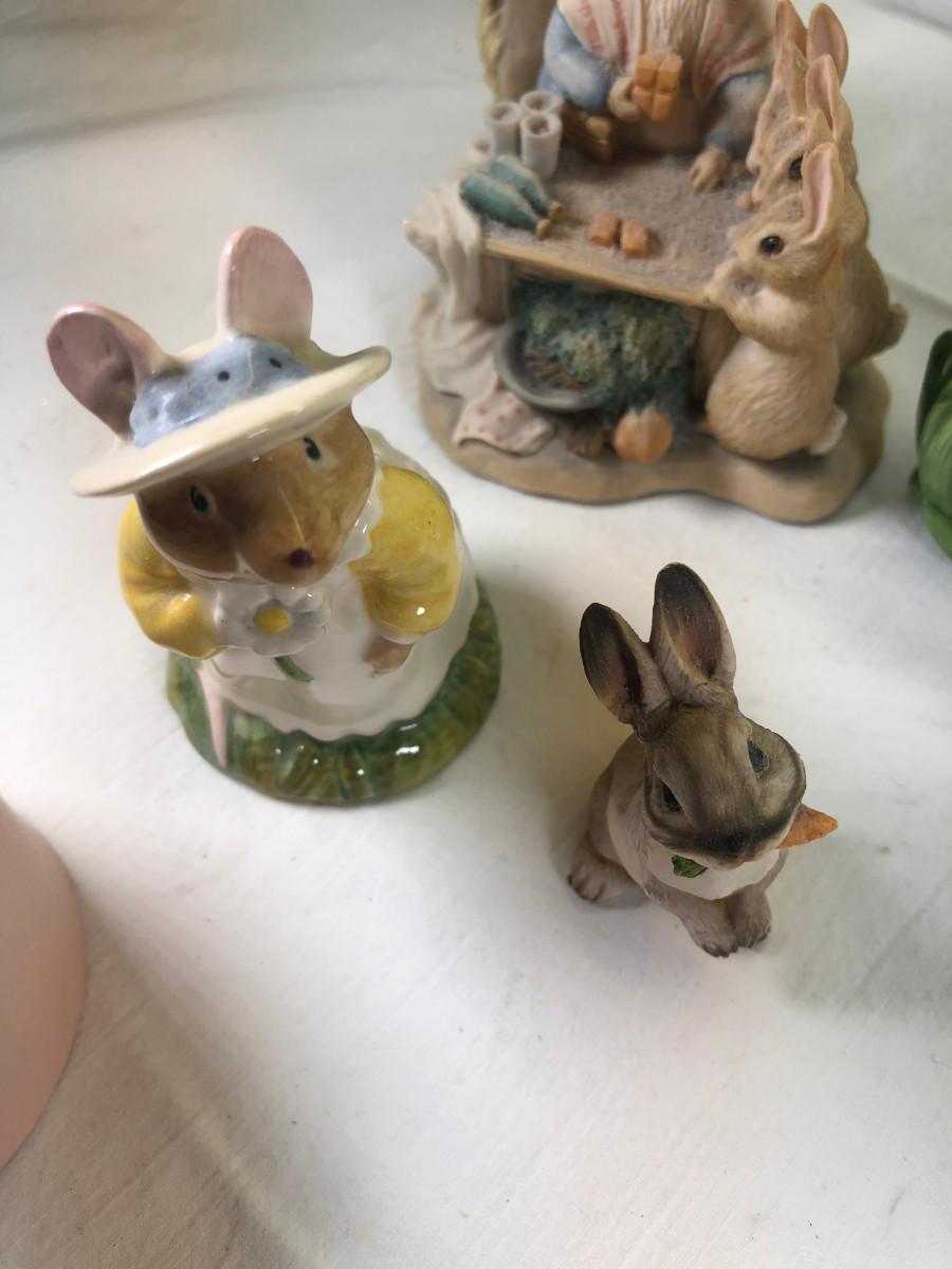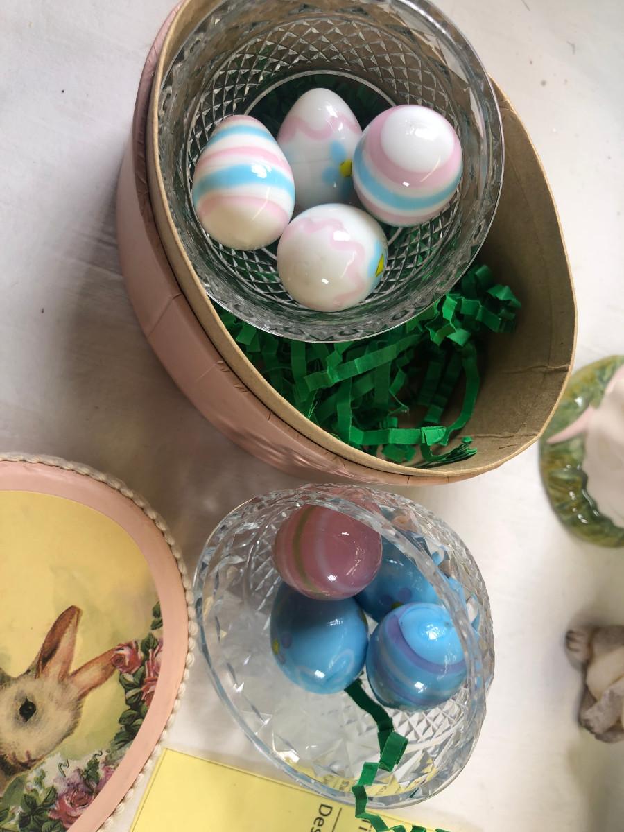 Mice and Rabbit figurines Glass eggs, Bunny plates,
