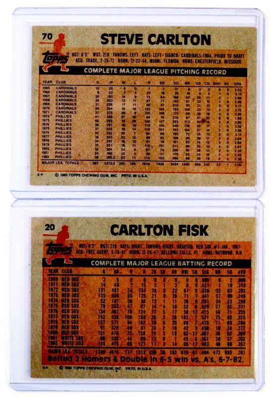 1983 TOPPS #20 CARLTON FISK #70 STEVE CARLTON BASEBALL CARDS SET - EX